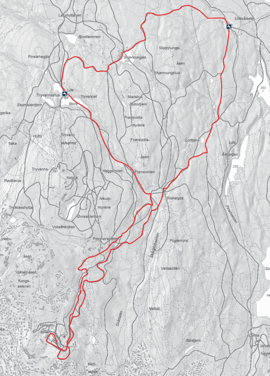 Traséen ut fra Holmenkollen er den samme som benyttes under World Cup – og heller ikke her får du noen enkel start. Det er nærmere 100 høydemeter fordelt på 1,5 kilometer, så det lønner seg å holde litt igjen i starten. I Holmenkollen går du på kunstsnø, som ofte oppleves annerledes enn natursnøen lenger inne i Marka. Nedenfor Frognerseteren fortsetter løypa inn på den gamle 5-mils-traséen. Ved Ullevålseter, etter drøyt sju kilometer, ligger løypas første drikkestasjon.