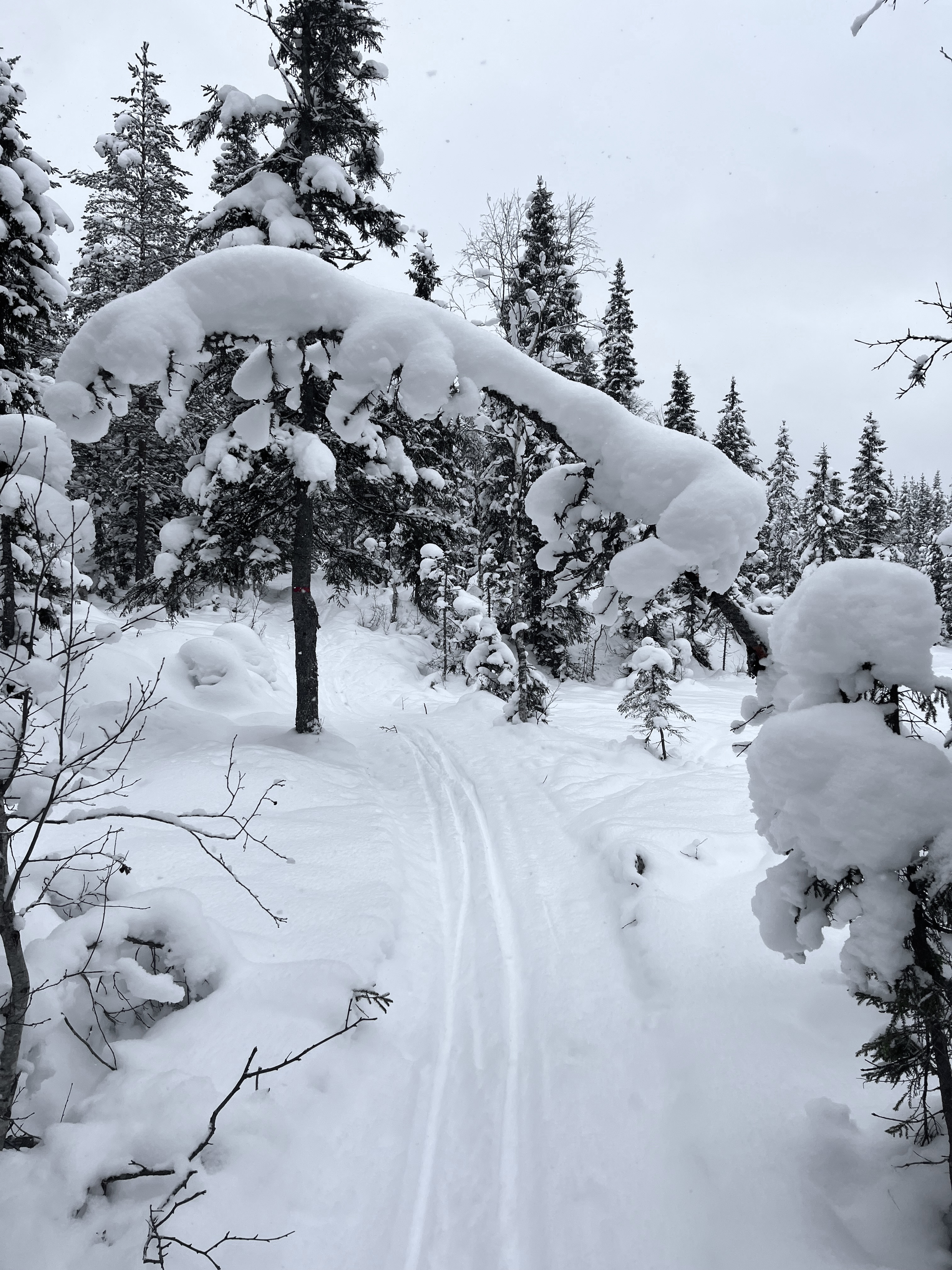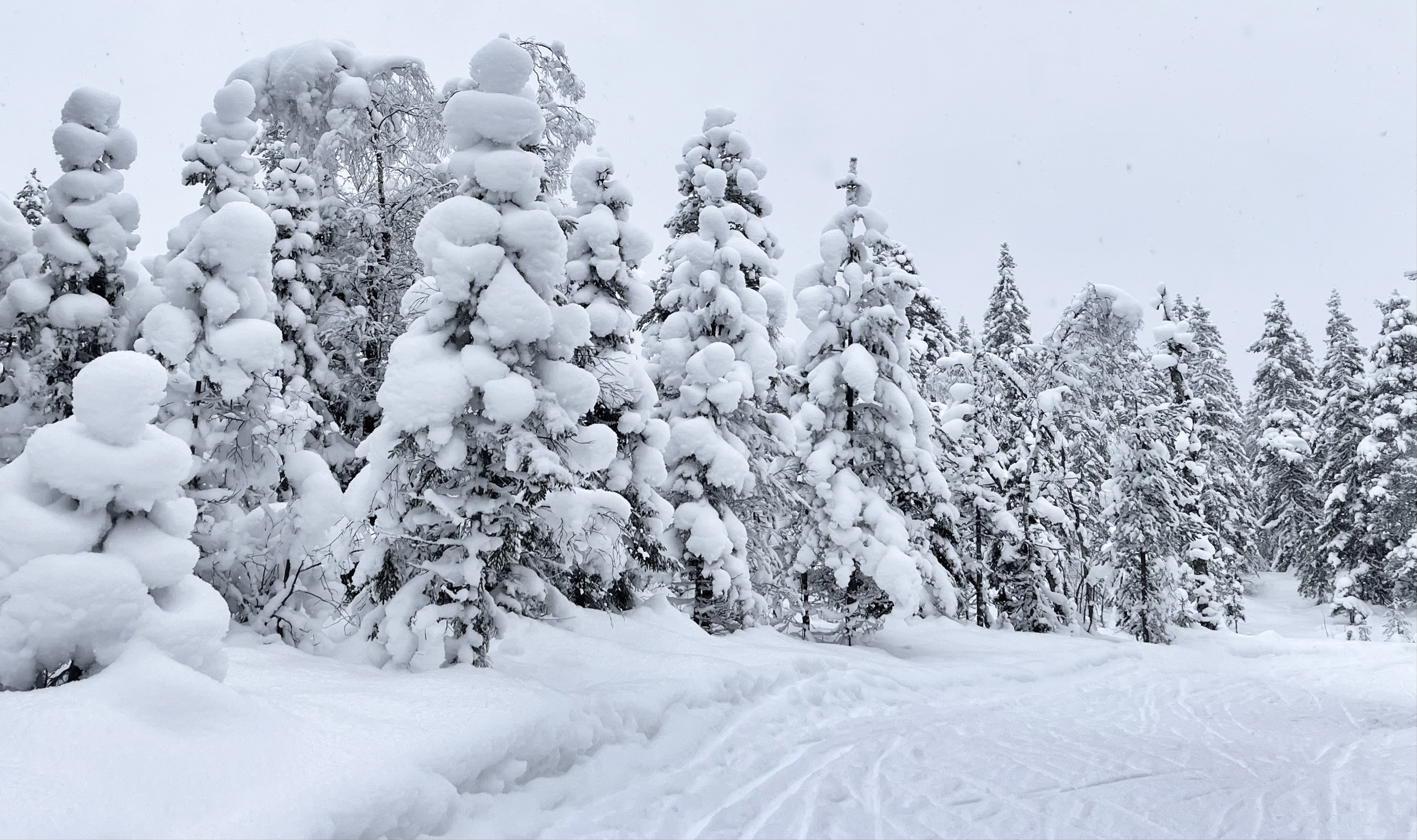 Det snødde tidvis kraftig i Kikut-området i dag, noe disse trærne bar tydelig vitnesbyrd om.