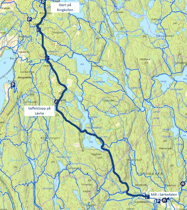 Sti fra Ringkollen til Løvlia (med stopp og påfyll her, selvsagt!).
