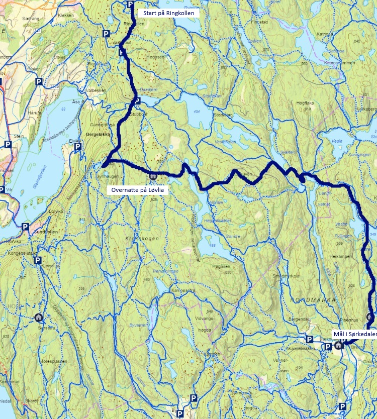 Dag én: Sti fra Ringkollen over Gyrihaugen til Løvlia. Nyt høstkveld på Løvlia og overnatt der til neste dag. Dag to: Sti forbi Nibbitjern over Oppkuven via Svarten til Kikut og ned i Sørkedalen eller Sognsvann. Rundt 12 km den ene dagen, 22 (+) km den andre. Stort sett sti hele veien.