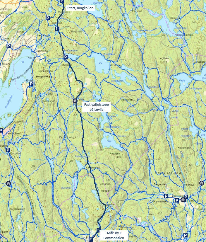 Rolig løpetur fra Ringkollen, via Løvlia (det skjer ikke at jeg drar på tur uten å teste vaffelfasilitietene underveis), via Kampesetra, ned til Lommedalen. En tur på rundt 25 kilometer. Buss hjem derfra.