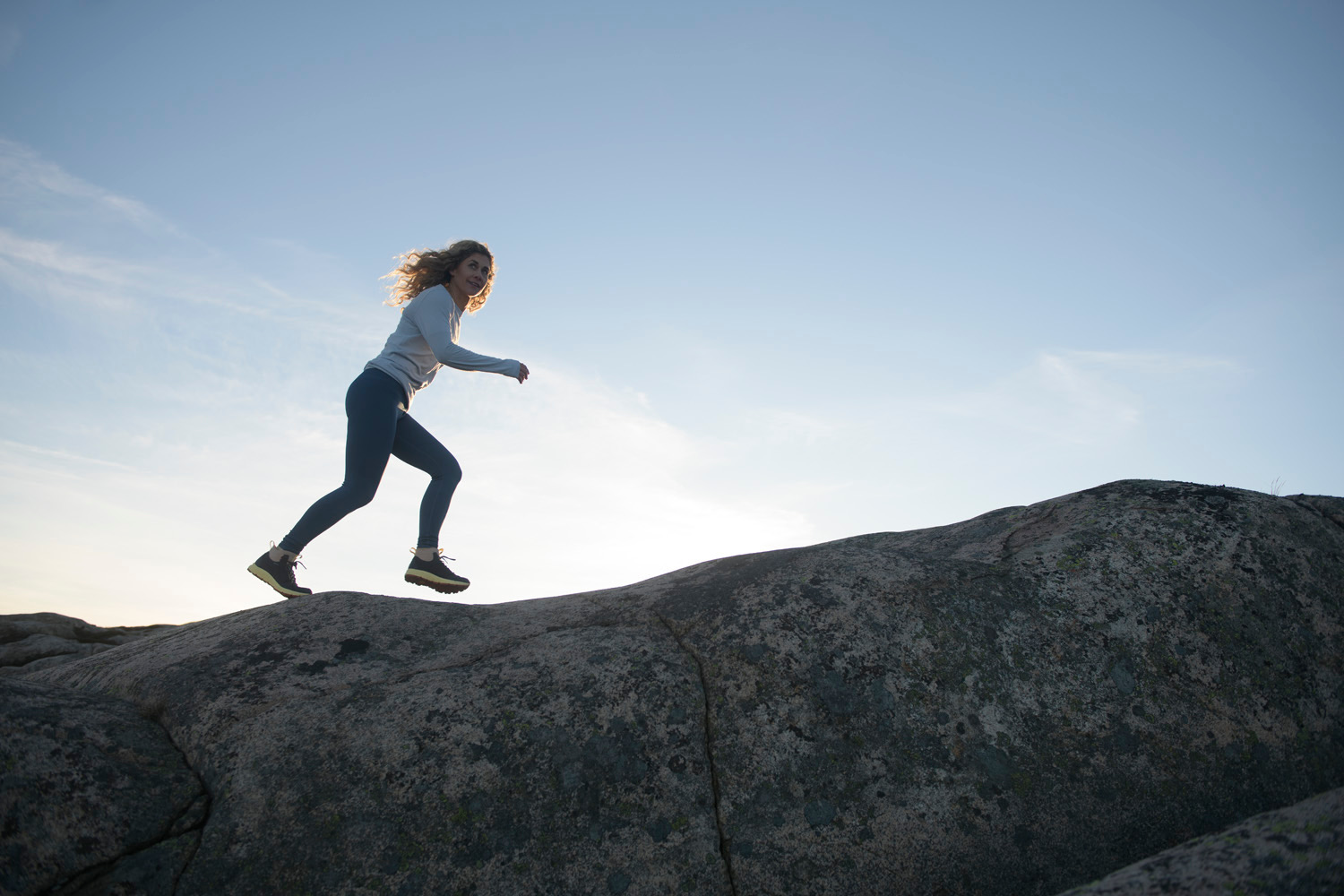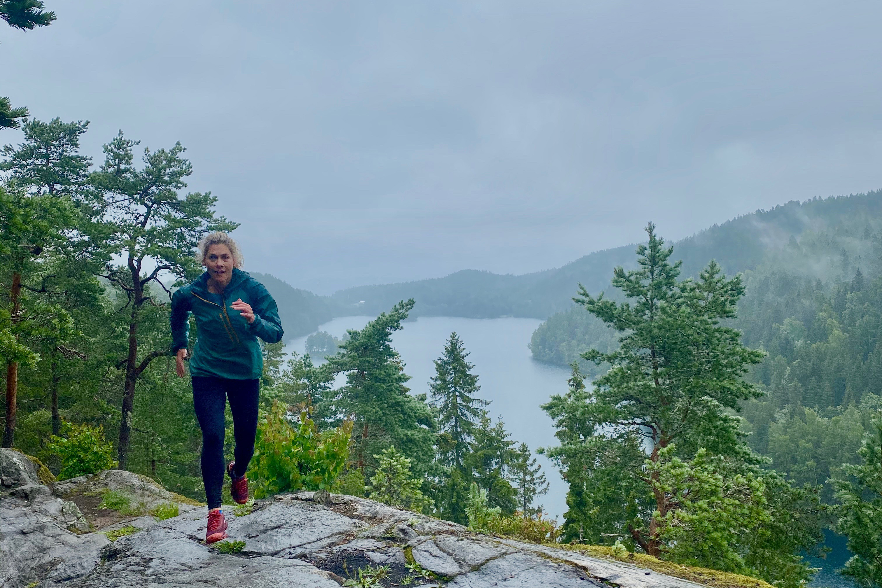 – Jeg løper ikke for å prestere. Jeg løper for å være ute, for å få ro i hodet og kjenne at kroppen fungerer. Det er tilfredsstillende å ta sats over dørstokken, uansett vær, og la kroppen få jobbe litt, løfte legemet over røtter, stein og kvist. Trippe, flyte og nesten fly over langstrakte svaberg.
