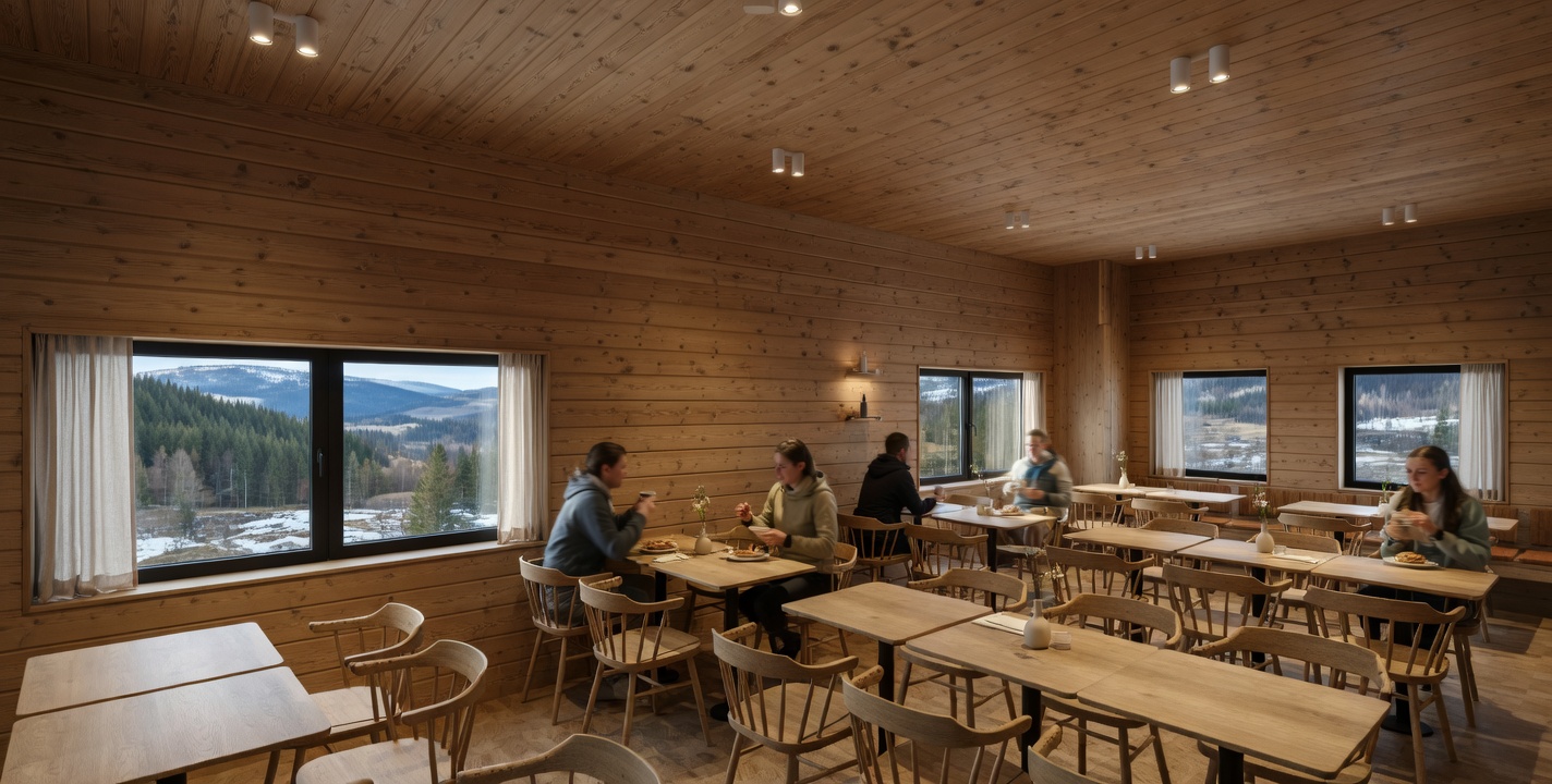 Markastue med spisesal, kiosk/resepsjon, peisestuer, badstue, selvbetjeningsdel, storkjøkken og bestyrerbolig (4-roms, ca. 90 m² over to etasjer).