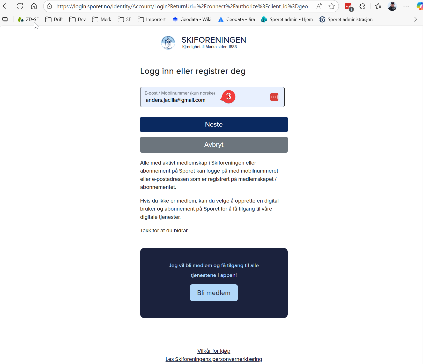 NB! Bruk feltet som angitt på bildet under og ikke trykk Bli Medlem