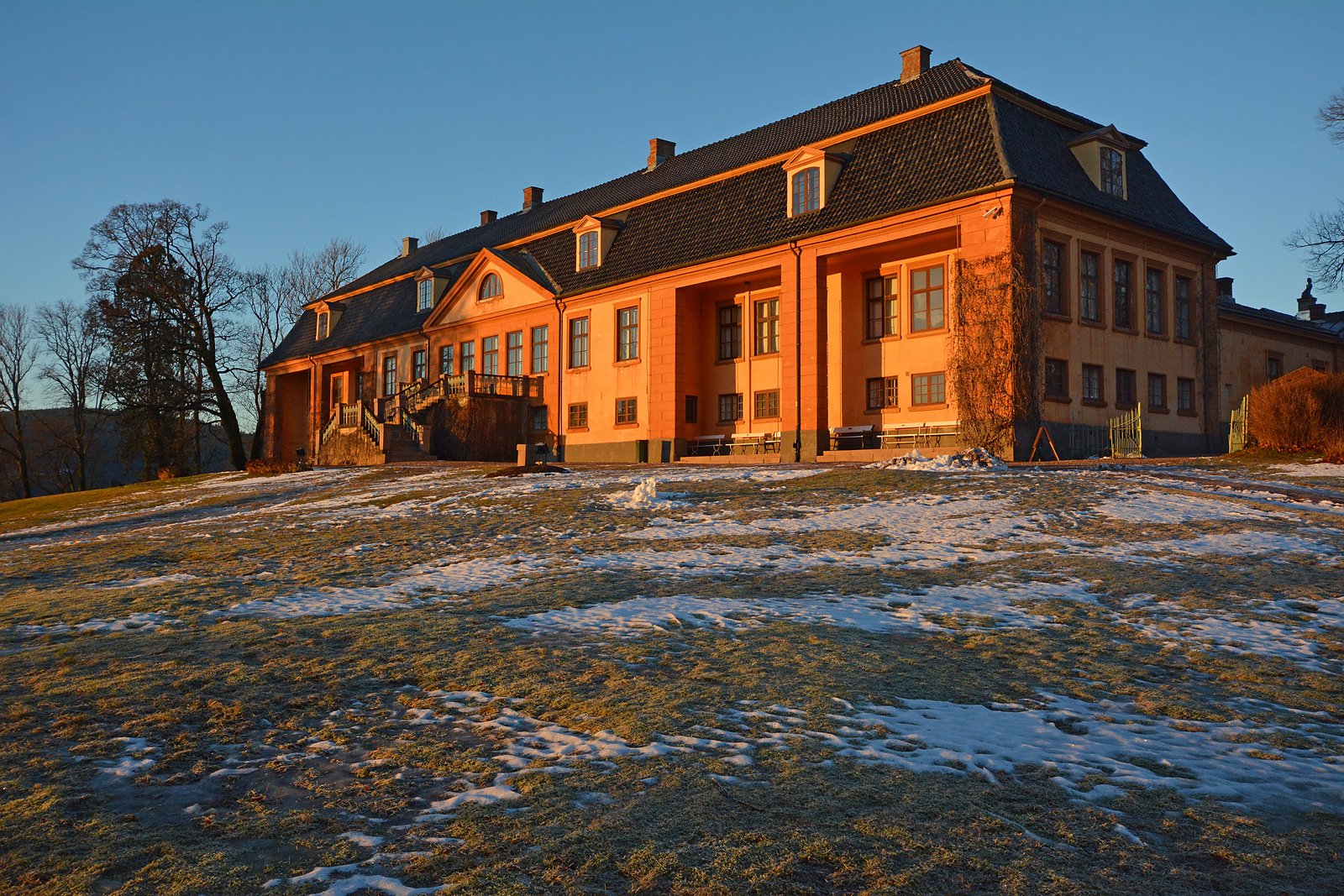 BOGSTAD GÅRD: Det er desember med is og snø, men plenene er fortsatt grønne rundt Bogstad gård. Hovedbygningen får akkurat det siste gylne streifet av sol på i årets tidligste solnedgang. Fra nå av blir det langsomt lysere om ettermiddagen, mens soloppgangen fortsetter å komme senere inntil 27. desember, da også den snur.