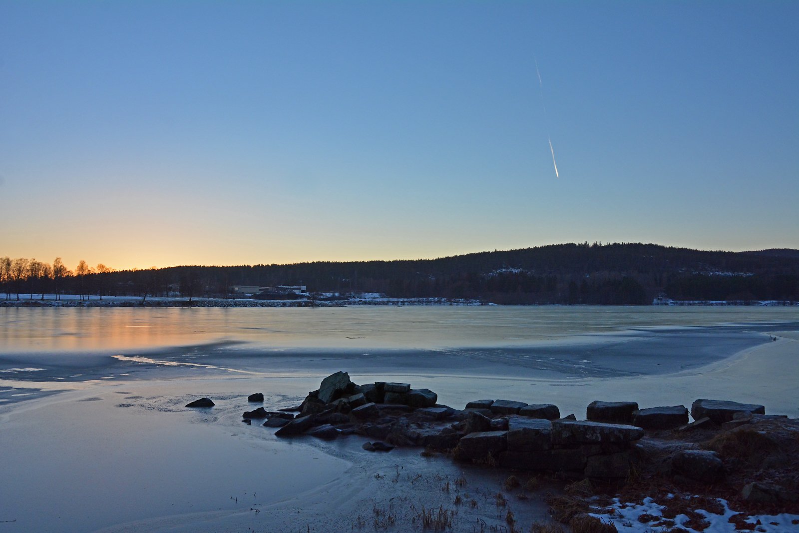 Ved Solberg har elva riktig retning i forhold til solen der den nå balanserer lavt på åskammen, og gir de siste solstreif på elveisen. Her treffer vi også en skøyteløper med kurs for Sørkedalen skole. Dagens tredje og siste menneske på elva i løpet av turen. Selv om det fortsatt er sol i åssiden mot Ringeriksflaka, er den nå bak åskammen for oss. Kulda kommer fort på. Ved Pinsle er det på tide å snu. Vi kommer tilbake til Bogstadvannet akkurat idet de siste solstrålene treffer toppen av dampsøylen fra bruget. Lysløypa rundt Lathusåsen er tent. Folket haster tilbake til bilene sine. Etter mer enn tre timer på ski og utallige runder på Bogstadvannet har også milslukeren har fått sin dose, rister rimet av seg og drar til sitt.