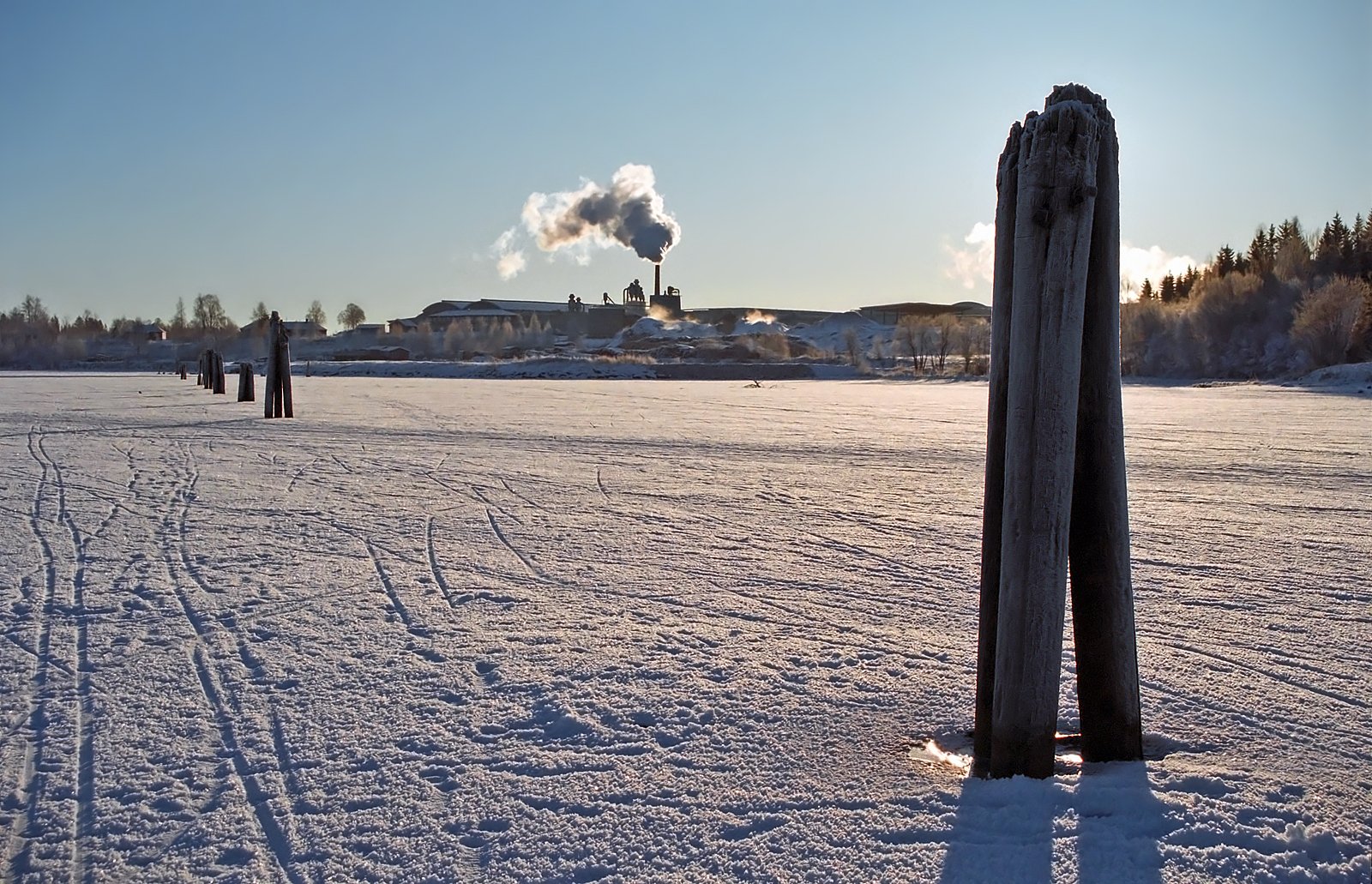 Ute på isen dominerer Fossum Brug utsikten mot syd. Selv midt på dagen nå midtvinters klarer ikke solen å stige klar av dampskyene fra bruget, som kaster lange og dramatiske skygger over isflaten. Opp av isen stikker en rad med tømmerdopper. Et minne fra en ikke altfor fjern fortid da vassdragene fortsatt var viktige for tømmerdriften i Marka.