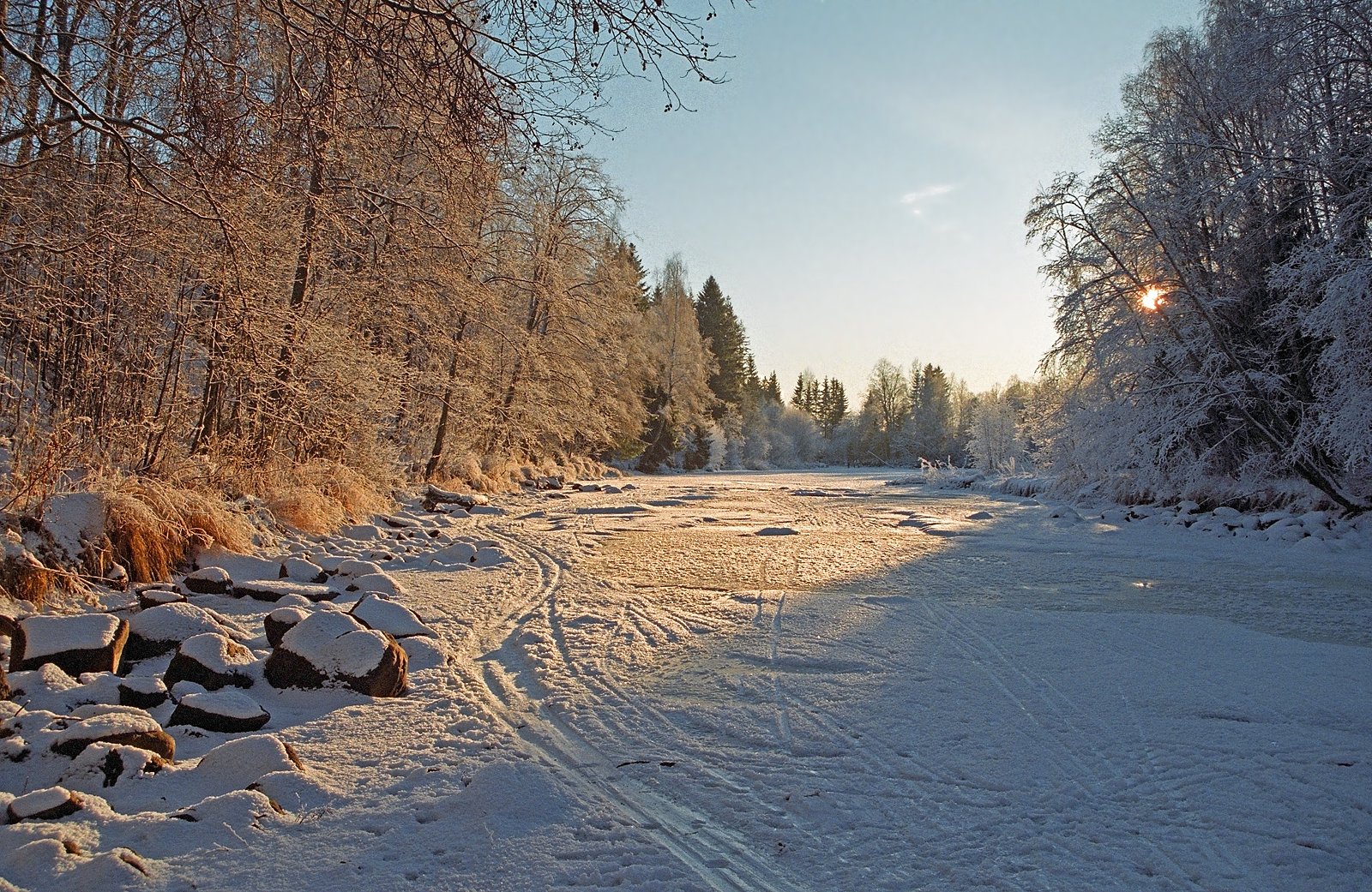 SOLBLINK: Tett kratt langs elvebreddene og tykt rim gjør at solen stort sett bare viser seg som blink mellom trærne, om ikke elva har helt riktig retning i forhold til solen slik som her.