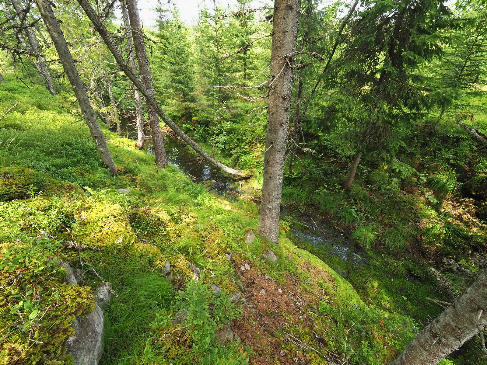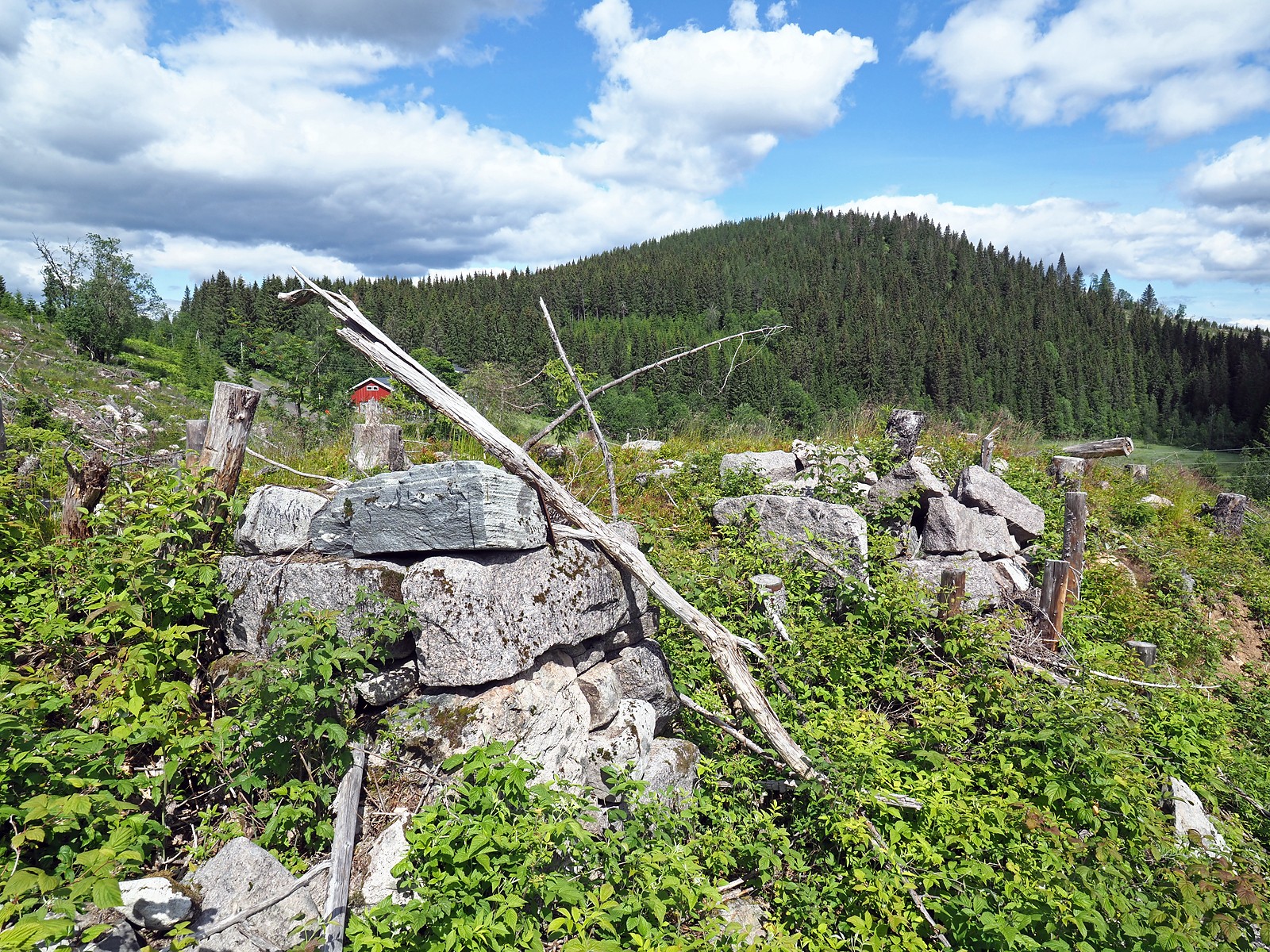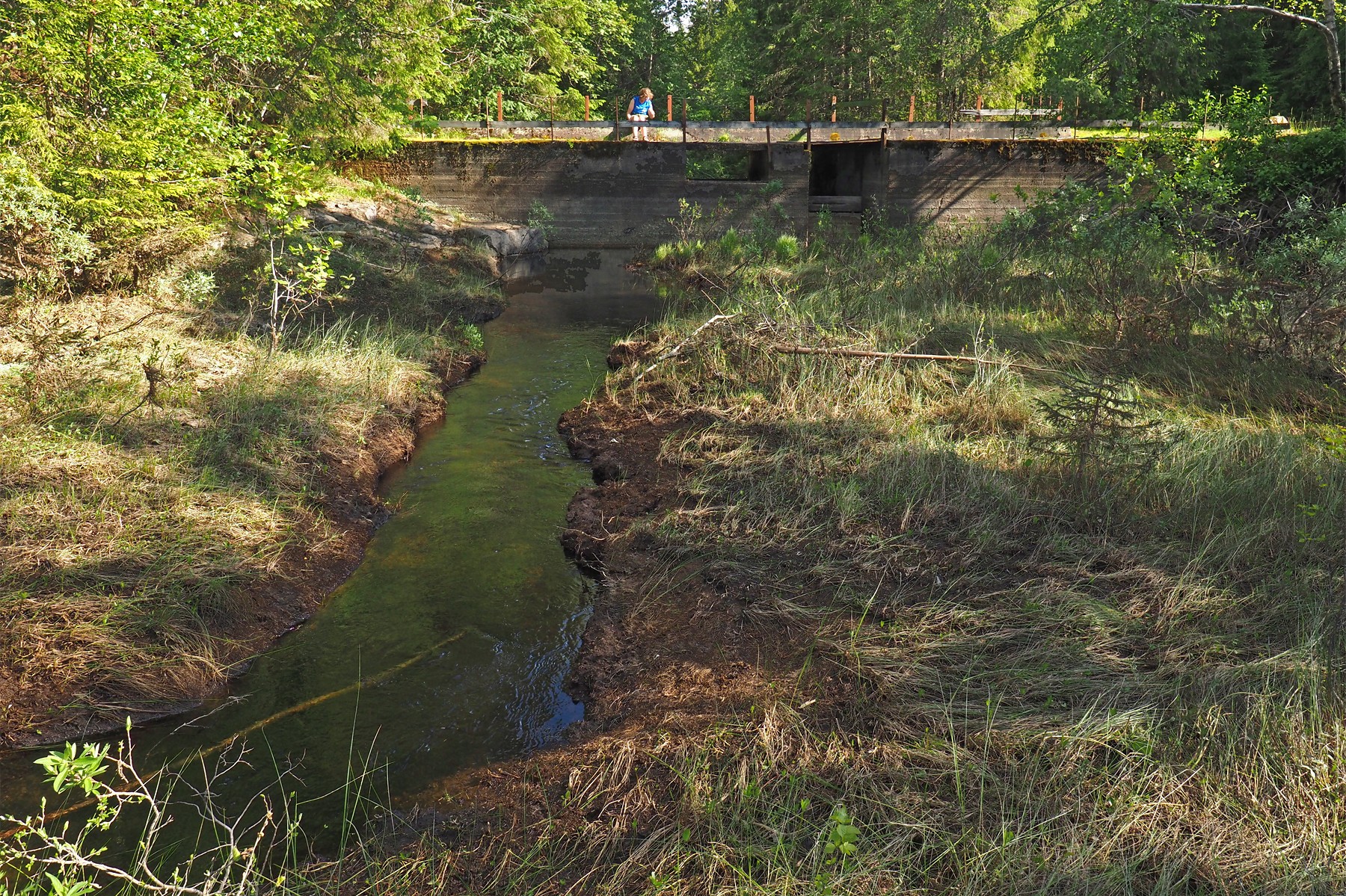 DEKKET AV SKOG: Denne demningen har vært gjemt av stor skog i mange år, og var nok temmelig ukjent, selv om skiløypa gikk rett forbi. Nå har flatehogsten åpnet opp landskapet, og slik tar den seg ut fra skiløypa en julidag. Bak demningen er det nå nesten gjengrodde øvre delen av magasinet til saga, Knippahøla, synlig.