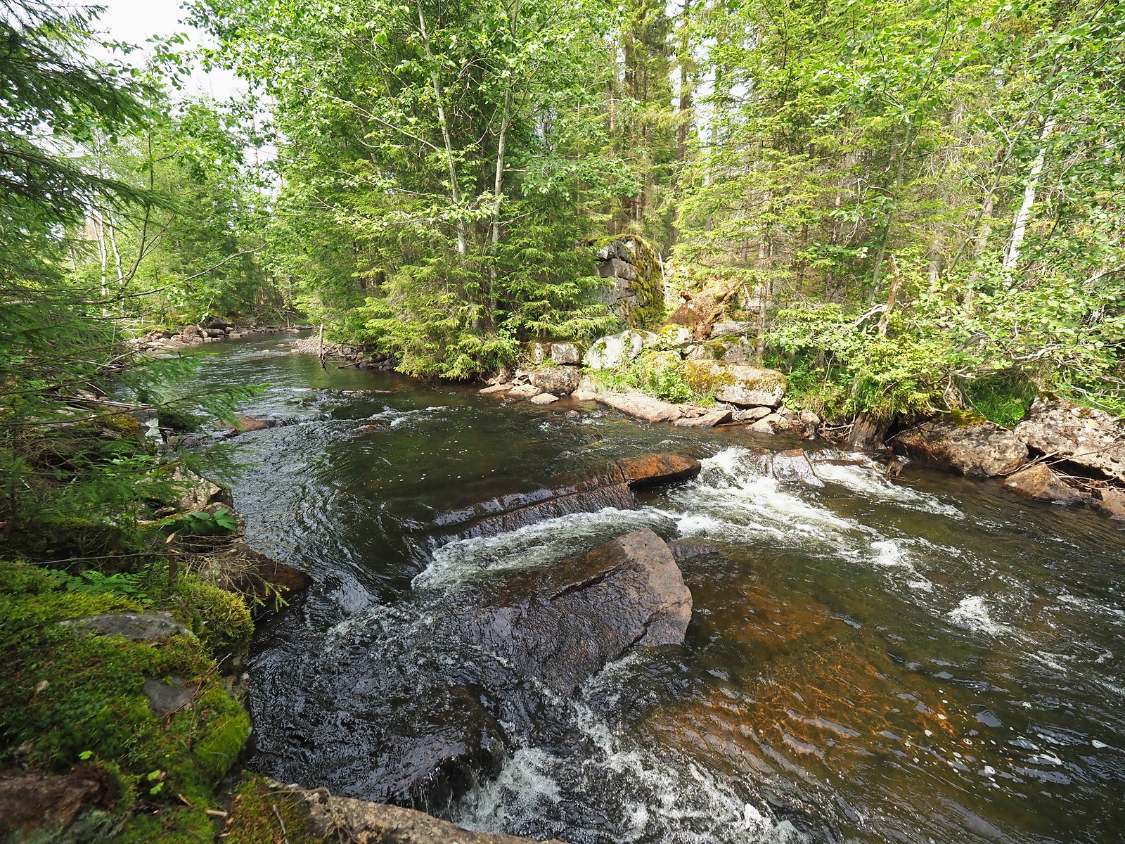 TØRRMURT DEMNING: Fløyta, også kjent som Myllsfløyta, er tjernet rett øst for Myllsdammen. Fløyta var også demmet opp med en demning for at vannet i elva skulle bli ført over til enda en dam rett ovenfor Sliperiet. Men hvor var nå denne demningen? Fra brua over elva ser det ut som om elva bare har skåret seg gjennom en jordrygg. Men går du øst for og nedenfor denne, viser denne tørrmurte demningen seg. På vannsiden har den blitt forsterket med en solid jordvoll.