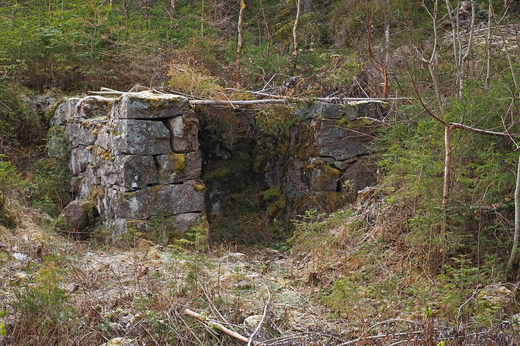 HESTESKOFORMET MUR: Fra Kubbdammen og nesten til Friland går det en gravd kanal. Den går helt inntil den solide murkonstruksjonen på bildet. Hva murkonstruksjonen hadde for funksjon, er ikke kjent for Lunner historielag. Fra utløpsdemningen i Kubbdammen til muren er det nesten ikke fall, og det er heller ikke flere rester etter installasjoner lavere i terrenget. Hvis de lagret tømmerstokker i Kubbdammen og skar kubb før tresliperiet, kan den ha hatt noe med kubbkapping å gjøre, men det blir gjettverk.