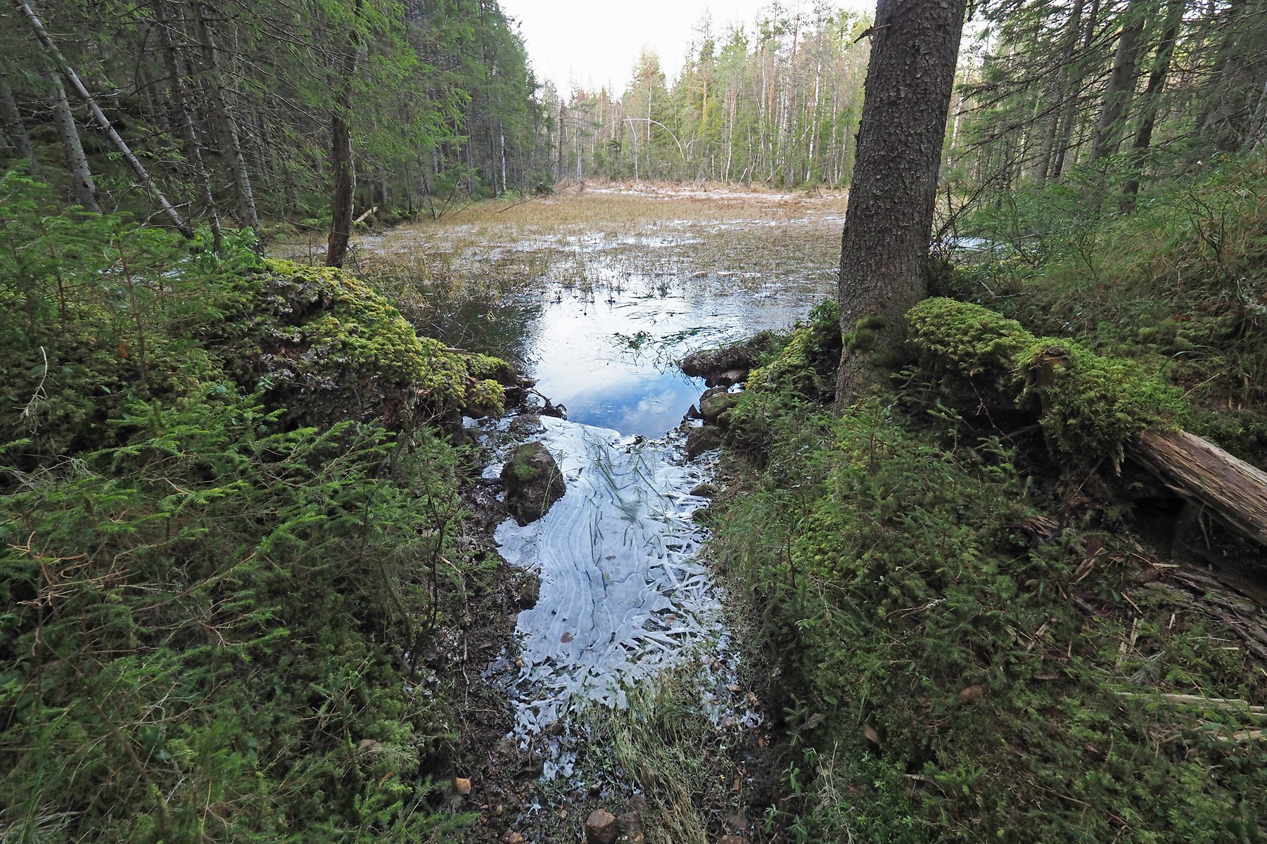 MYR OG BEVERFELTE TRÆR: Terrenget ovenfor Noackdemningen er ganske flatt, og elva deler seg i flere løp der. En blanding av myr/sump og beverfelte trær gjorde det svært tregt å ta seg frem langs det nordligste løpet. Bare trær som var gnagd for en god stund siden, ingen beverhytte eller demning. Men beveren hadde hatt større ambisjoner enn et sideløp: Rett etter at alle tre løpene hadde gått sammen igjen, hadde den demt opp hele Myllselva. Aktiviteten i et stort, litt eldre hogstfelt rett ved hadde antageligvis fordrevet beveren, og så hadde en flom tatt nesten halve demningen.