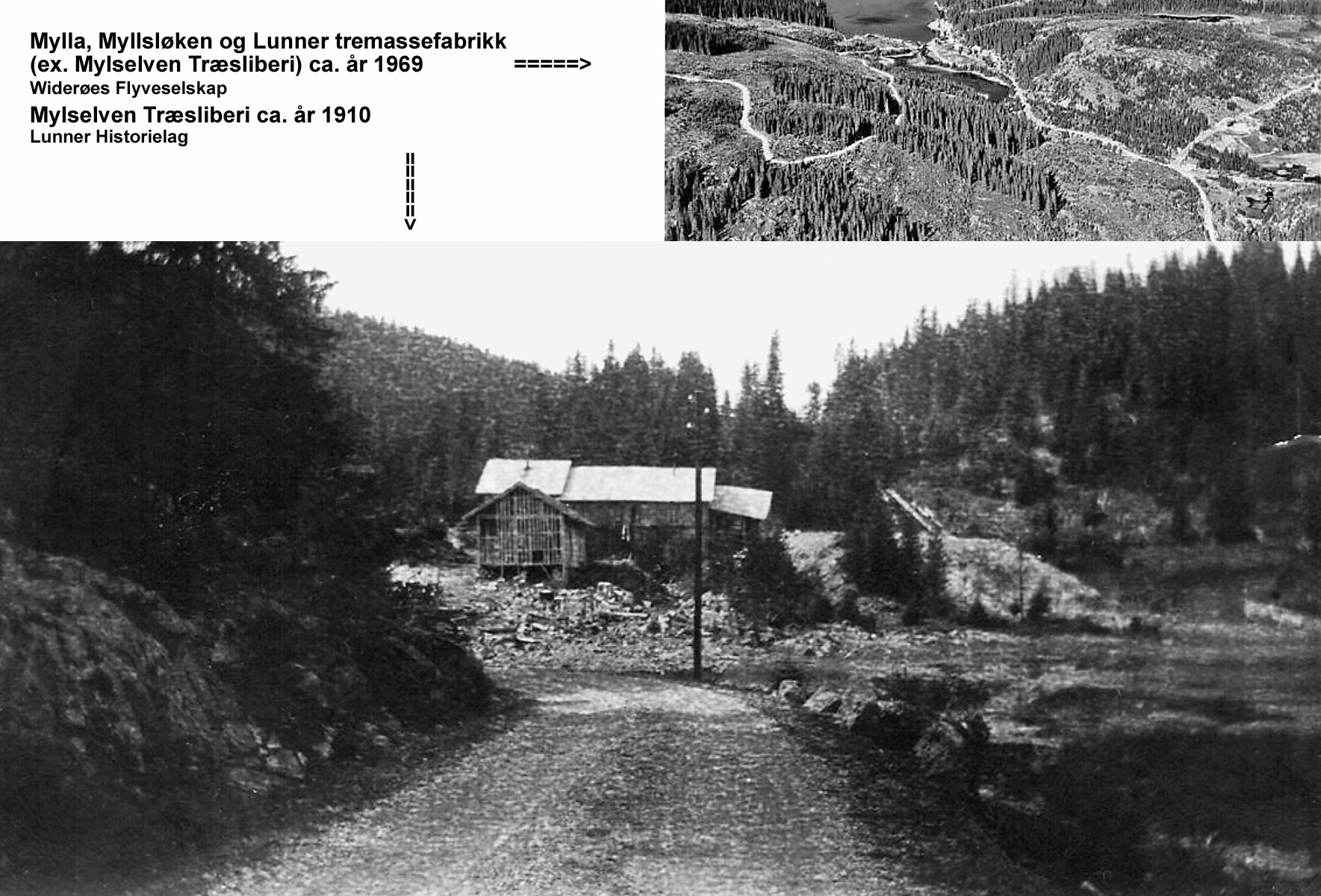 FLYFOTO: Det lille bildet er et utsnitt i full bredde av et større bilde av området øst for Mylla. Bildet er et flyfoto tatt av Widerøe Flyveselskap, angivelig i 1969, men med spørsmålstegn bak årstallet. Det er fritt tilgjengelig i Oslo Byarkiv i denne grove oppløsningen. Bildet viser østenden av Mylla, Myllsfløyta og muligens to bygninger øst på Sliperiet. Det store bildet kommer fra Lunner Historielag, og kan vise en av fabrikkbygningene ved Sliperiet. I bakgrunnen skimtes muligens også en bit av rørledningen til turbinen. Bygningen ser meget luftig ut, men har likevel to skorsteiner. Muligens en lagerbygning? Den har ikke grunnmur, men står på pillarer. Dett kan forklare mangelen på ruiner i området. Bildet kan ha vært håndkolorert. Dette, og lavspent trefase kraftledning kan tyde på at det kan være tatt i tiden rundt første verdenskrig.