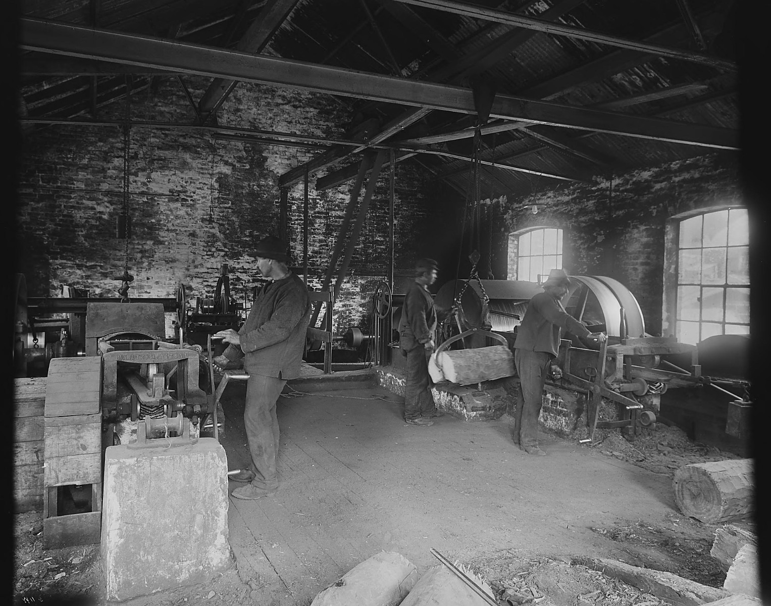 FARLIG ARBEID: Det er ingen bilder tilgjengelig av interiøret i Sliperiet, men dette bildet fra Funnefoss Tresliperi tatt i 1913 av A. B. Wilse kan gi et inntrykk av maskiner og interiør. Til høyre i bildet henger en kubbe i en tømmersaks klar til sliping mot den runde slipetrommelen bak den. Foran denne står et mateapparat som betjenes av en arbeider. På venstre side er det et tilsynelatende likt mateapparat, men det er ikke mulig å se hva som står bak dette. Arbeidsantrekket er også tidstypisk. Dette var ikke en farefri arbeidsplass, da kubben kunne sperre i trommelen og hoppe ut.