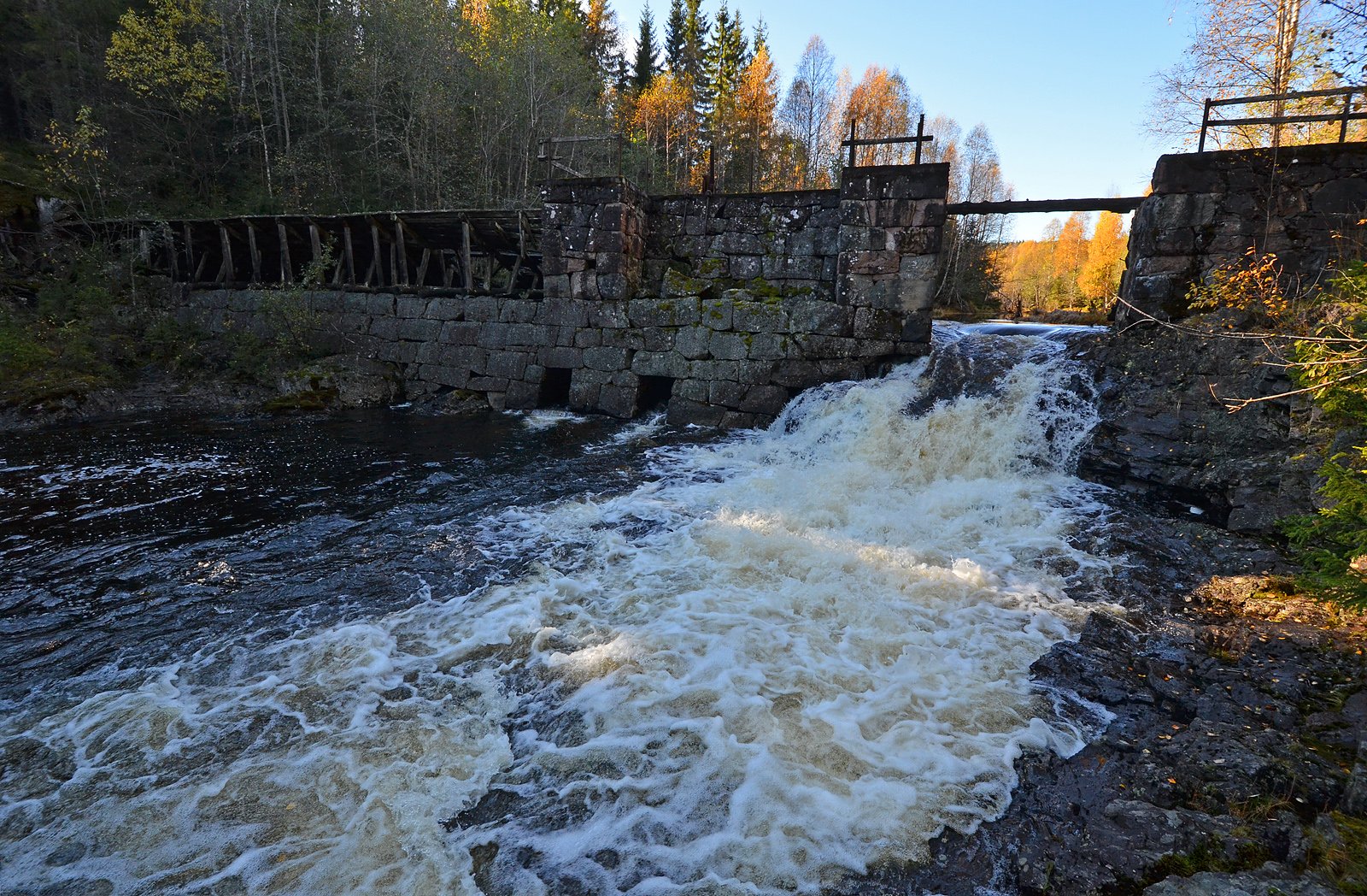 STÅR STØTT: Den midtre delen av demningen består av en steindemning med krone av betong, og har klart seg bra mot tidens tann. Deler av reguleringsmekanismen er fortsatt på plass. Selve steinkonstruksjonen er avsluttet som en horisontal flate, mens betongen er lagt med hellning mot vannsiden.