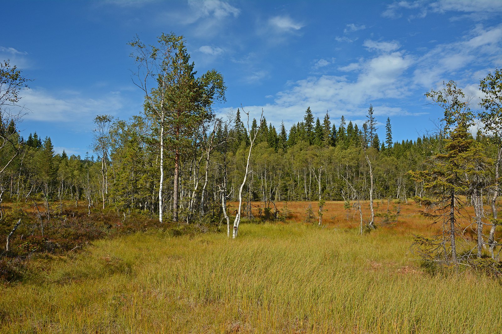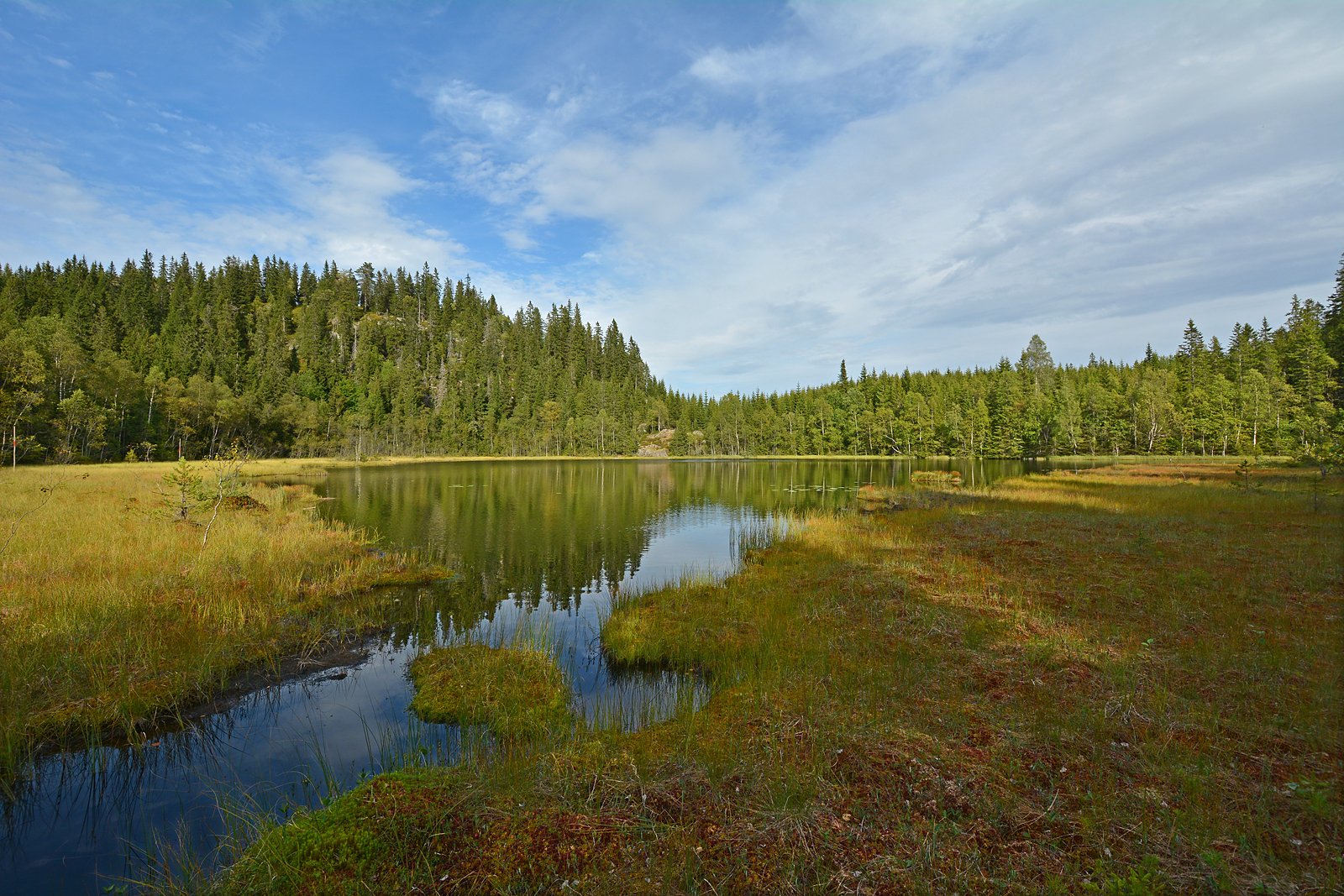 VESTRE OTERTJERN: Bildet viser Vestre Otertjern sett fra nordvestenden. Tjernet er omgitt av brede myrstrekninger overalt, unntatt langs vestbredden. Her er myra smal med upasserbare bløthull, og krattet langs kanten er tett og vanskelig å passere. Det er ikke å anbefale å gå langs vannet på denne siden. Rundt vannet ellers er det myr og flytetorver, vått, men ikke vanskelig å passere om man hele tiden planlegger noen skritt fremover. Litt til venstre for midten av bildet er myrtarmen til Østre Otertjern, hvor skiløypa krysser. Der ligger det stokker, men før det er det tuemyr som bekkesiget renner gjennom.