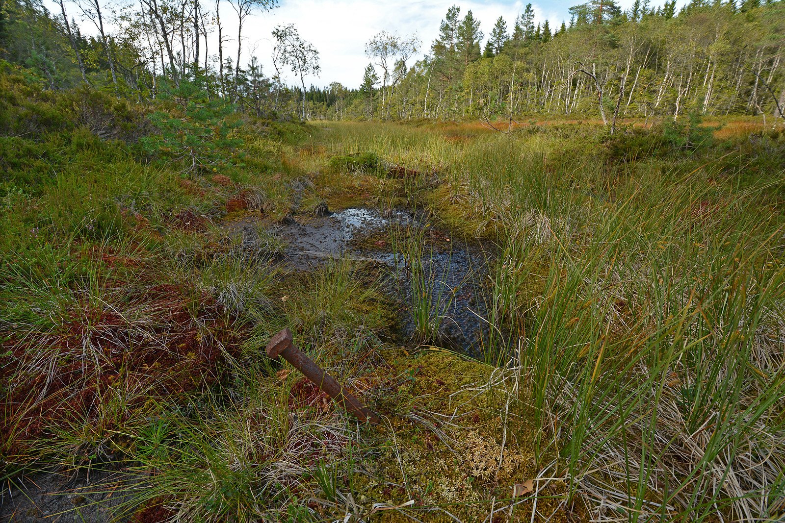 RENNE + BOLT: Renna mot syd fra Vestre Otertjern kunne innledningsvis lignet på et område hvor det er skåret torv, men blir raskt for dyp til dette. I renna står det også en solid jernbolt, som bekrefter at dette har med Otertjernsrenna å gjøre.