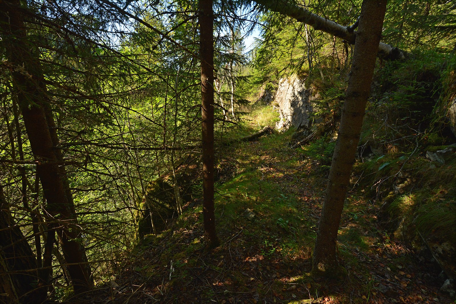 STUP: Den utsprengte renna ender over et stup, såpass høyt at man ser rett i trekronene på de velvoksne granene i dalen under. Her er det ikke sannsynlig at tømmerrenna har gått rett frem. Alternativet er en dreining mot øst inn i området med store steiner og skrenter på dette bildet. Jeg prøvegikk det, ikke ufremkommelig, og det hele flatet seg ut mot myra som ender i Vestre Otertjern. I myra var det et tydelig åpent parti som gikk rett mot der renna er tegnet inn på et kart fra 1930. Muligens et spor etter renna, selv om det ikke var noen tydelige rester av renna der, og jeg nok heller ville lagt renna i den tørre kanten av myra. Men den er helt gjengrodd av kratt nå.