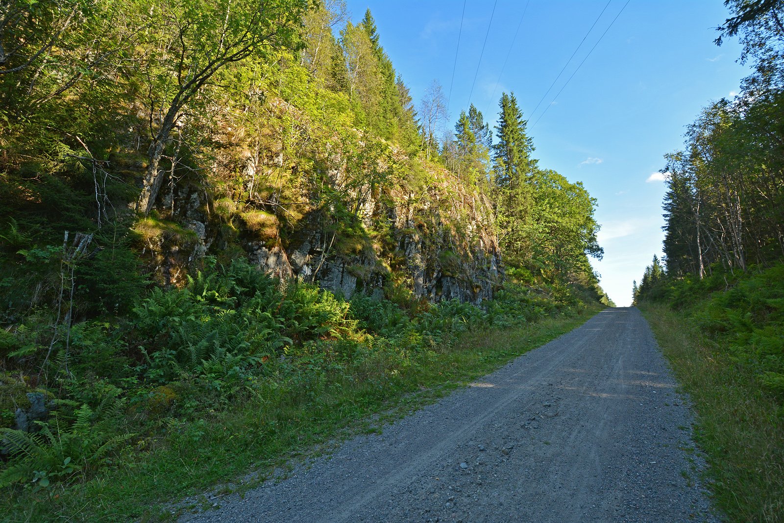 GRÅSETERVEIEN VED HOMLEBERGET: Den utsprengte hylla som Otertjernsrenna lå på er ikke lett å finne, selv om den ligger midt under kraftledningen. Det er enklest å ta den fra nord, der det går et svakt tråkk opp bratta før den går over til å bli et stup. Hylla er helt ute på stupkanten, og det er mulig å se veien fra den. Stien fører naturlig inn i et søkk som ser utsprengt ut, men som heller feil vei og fører til stadig nye skrenter. Bildet viser stupdelen av Homleberget.