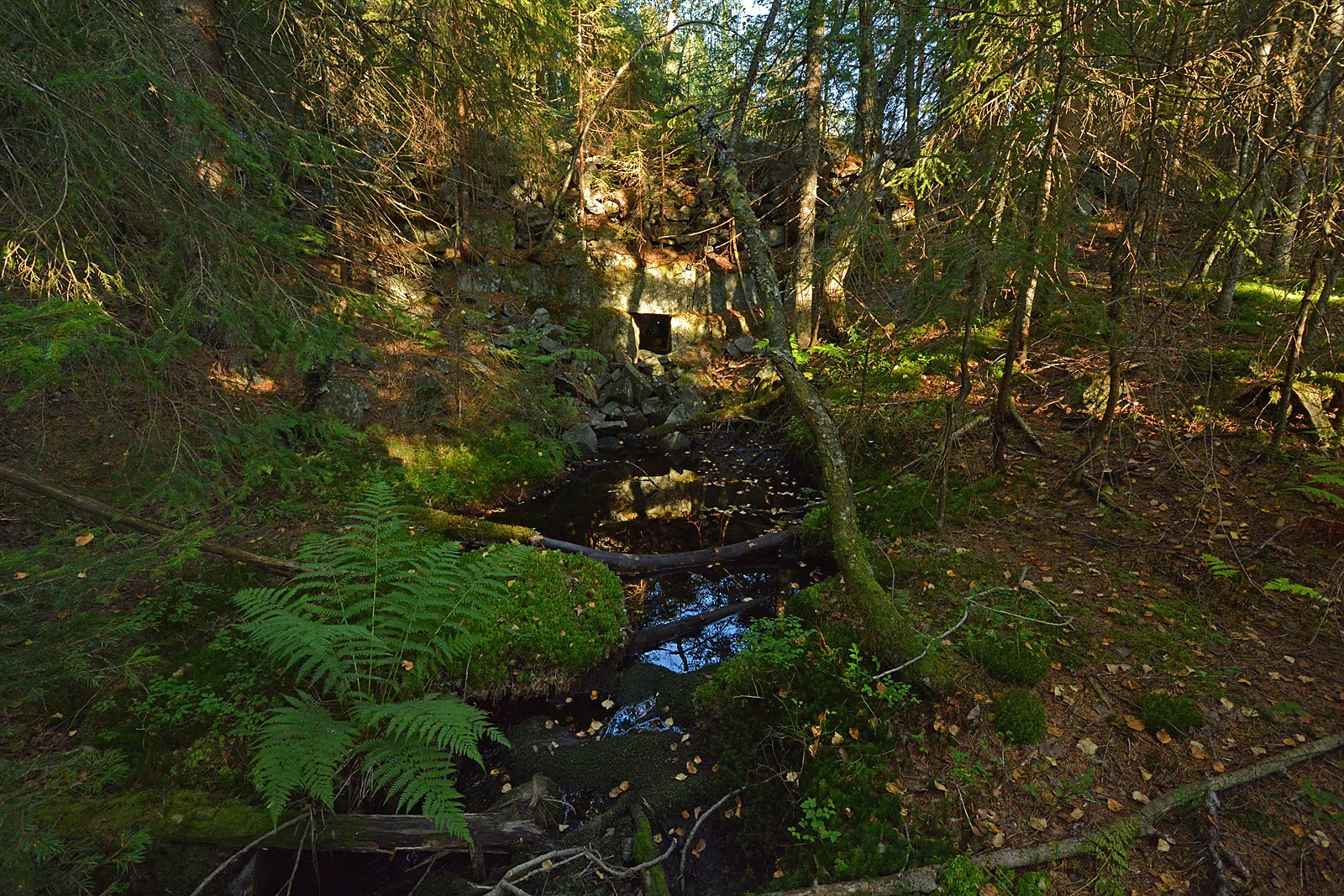 FLØTNINGSDAM: Følger du kanalen mot syd fra Vestre Otertjern inn i skogen, finner du de to steinrøysene på bildet, en på hver side av kanalen. Slike røyser er ganske typiske for laftedammer hvor tømmeret har råtnet ned. Inne i skogen er det også en rad med stokker som er slått ned i myra/skogbunnen som en fortsettelse av steinrøysene. Dette er rester av fløtningsdemningen som var starten på tømmerrenna ned til Slora, og den fortsatte i en utgravd renne videre nedover i skogen. Plasseringen av en demning på en høyde hvor vannet har naturlig avløp i motsatt retning, virker nokså ulogisk. Men en atthaldsdam av stein over avløpet i nord hevet vannstanden med tre meter, slik at Otertjernene gikk i ett. Jeg mener at vi fant spor etter denne på tilbakeveien da vi hadde besøkt kjentmannspost nr. 14 2008-10 i oktober 2008, men da var det kaldt, tett tåke og sludd/regn, og det ble ingen bilder der. Jeg mener også å huske at jeg fant deler av tømmerfagverket som bar tømmerrenna første gang jeg var i området for vel 40 år siden, men heller ikke da ble det tatt bilder.