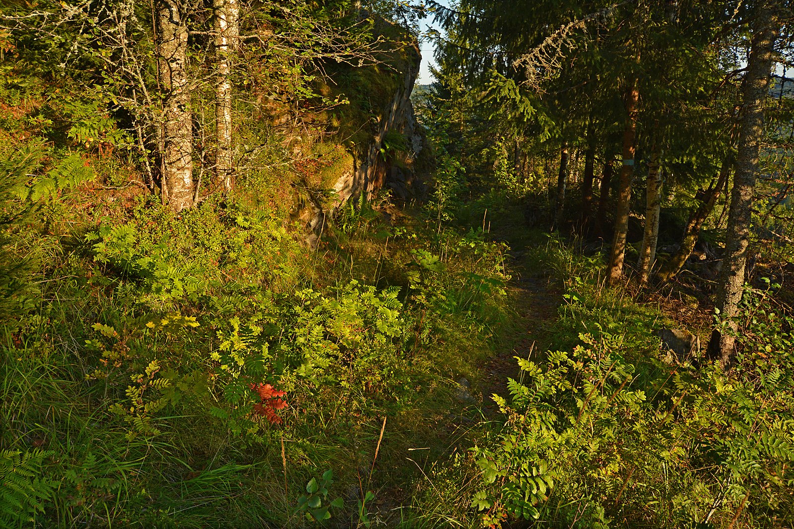 REVEKLEIVA: Bergveggen ved Revekleiva og utsikten mot Sørkedalen rett ved denne er vel det mest kjente på blåstien fra Slora mot Gråbergseter over Otertjerna. Her gjorde renna en ganske krapp sving. Dette skal være det eneste stedet det var nødvendig å sprenge langs den nedre del av Otertjernsrennetraseen. En fin rasteplass i dagens siste streif av sol.