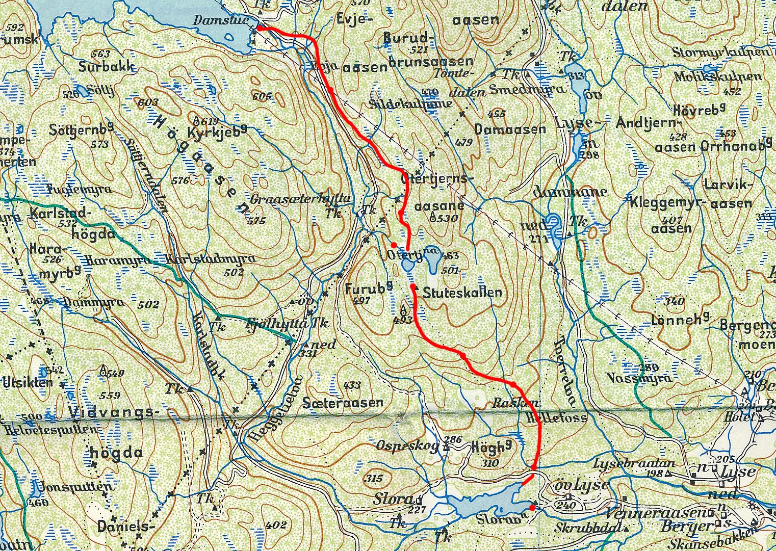 RENNEKONSTRUKSJONEN FJERNET: Otertjernsrenna startet på vestsiden av Heggelielva, men krysset høyt over elveleiet på en bro allerede etter snaue hundre meter. Deretter tok den en sving inn i dalen før Evjeåsen for å holde høyde, før den fortsatte omtrent parallelt med Gråseterveien, men høyere opp i bratta.