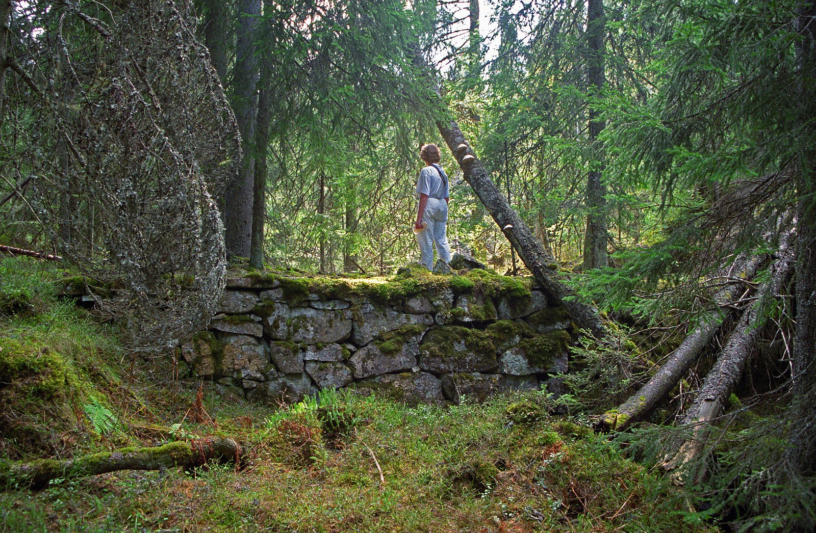 FINT STEINARBEID: Demningen ved Retthelltjern (A) er den eneste av de fire demningene som fortsatt ligger inntil vannet den i sin tid demmet opp. Et fint stykke steinarbeide, som har tålt tidens tann bra. Den ligger fortsatt nesten som en overdimensjonert steinbro på en gammel kjerrevei. Bildet er fra 2000, da det var nyhugget og åpent her fortsatt, og vi hadde lagt fjern/kulturposter i turorienteringen Flaggspretten i området. Nå har det vokst opp mye kratt, og demningen er ikke grei å fotografere, men fortsatt lett å se.