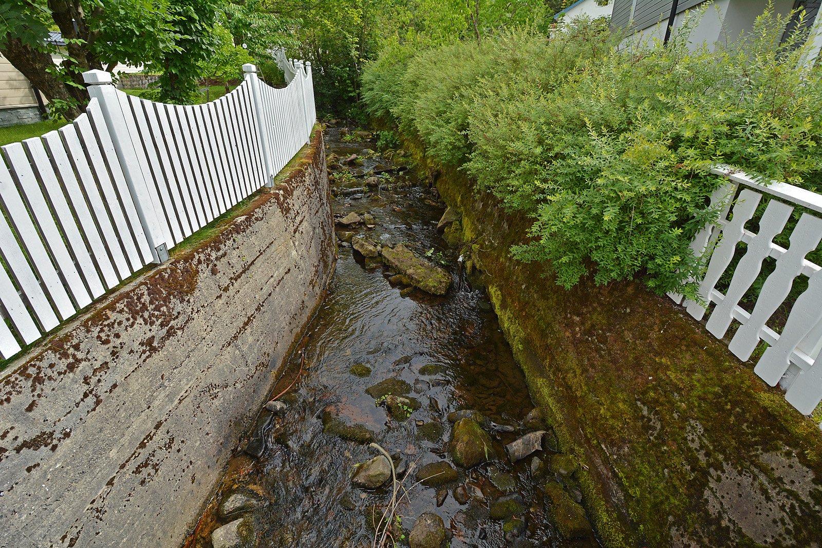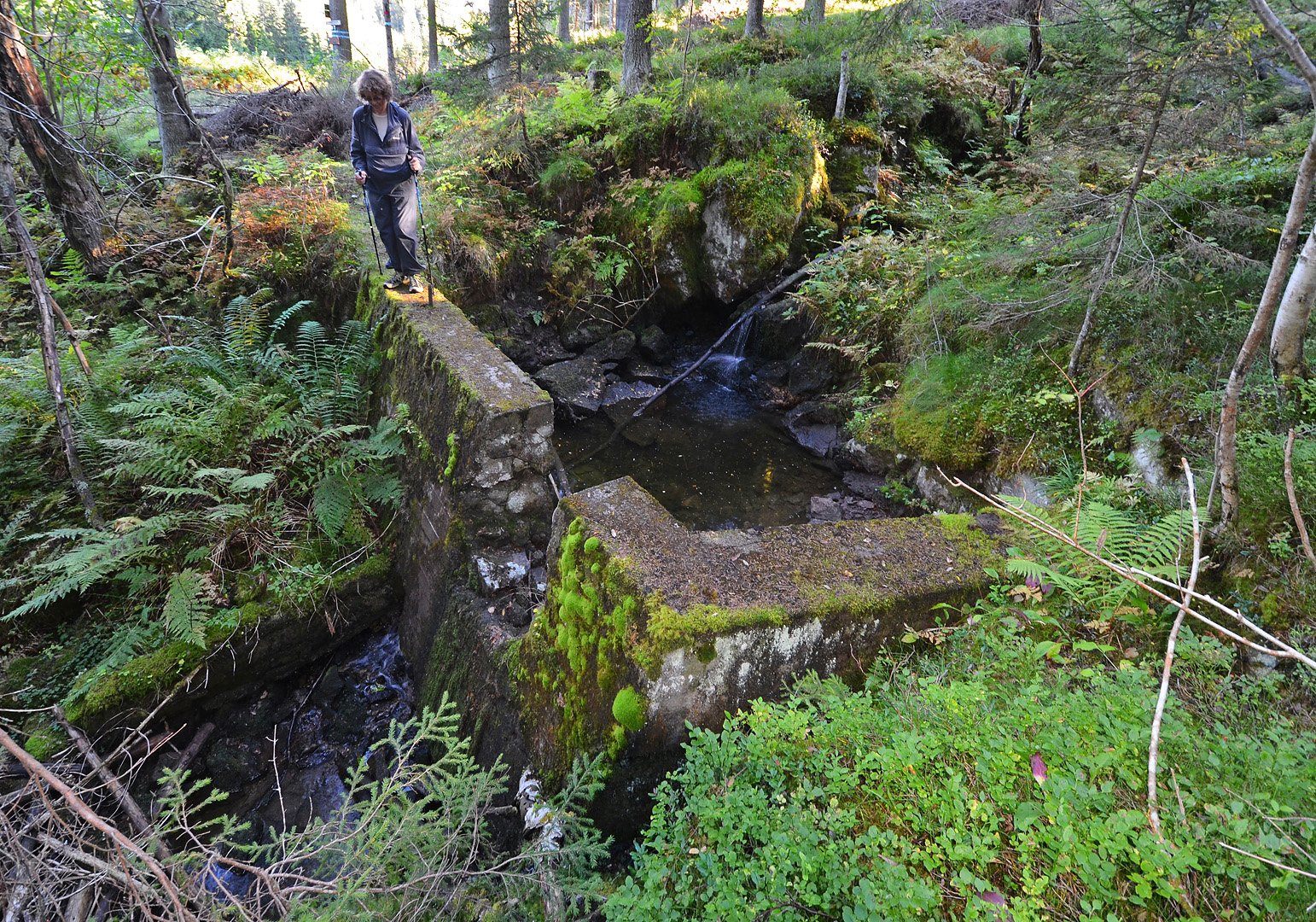 MOSEGRODDE RESTER: Dronningveien 7 ble bygget der Sundvoll-mølla sto. Eldre kjentfolk som vi senere traff ved Kongens utsikt, husket steinene i fundamentet, og at disse ble brukt som underlag for huset. Nå er bare de mosegrodde betongveggene i avløpet tilbake.