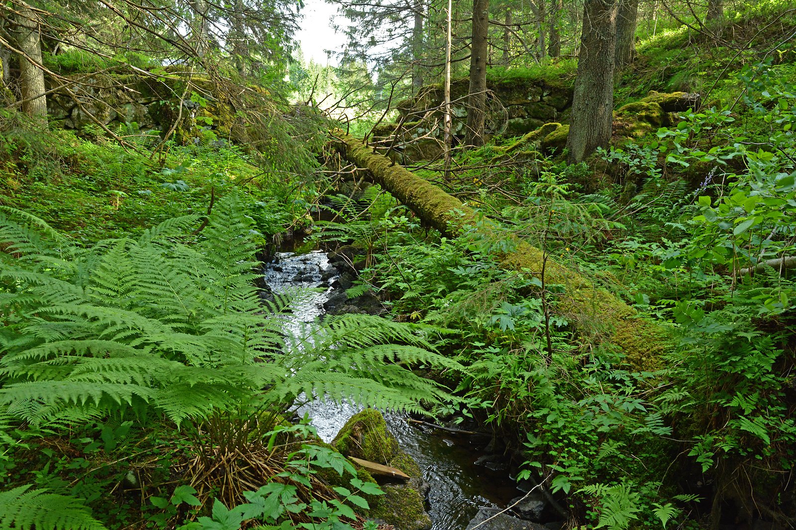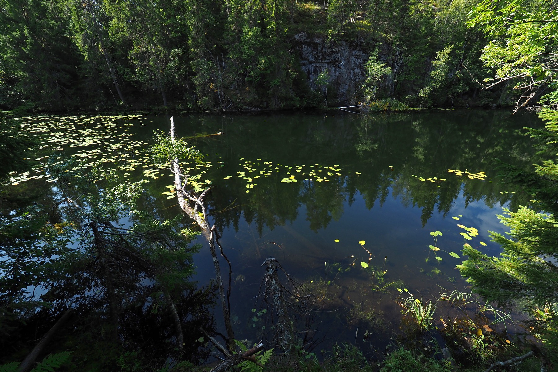 MØRKT VANN: Svarttjern nord for Nordsetertjern svarer ganske bra til navnet sitt allerede i fullt dagslys, mørkt vann, trangt med stup på begge langsider. Beliggenheten gjør at det naturlig var et reservoar for Sundvoll-mølla, men spørsmålet er om også dette vannet var oppdemt. Nå som bløtmyra mot syd var relativt tørr, undersøkte jeg den så nøye som det tette krattet der tillot. Det var ingen spor etter en steindemning, og heller ikke etter en enkel tredemning av stokker som var slått ned i myra, selv om bare en meter regulering opp ville øket vannarealet og dermed vannvolumet drastisk.