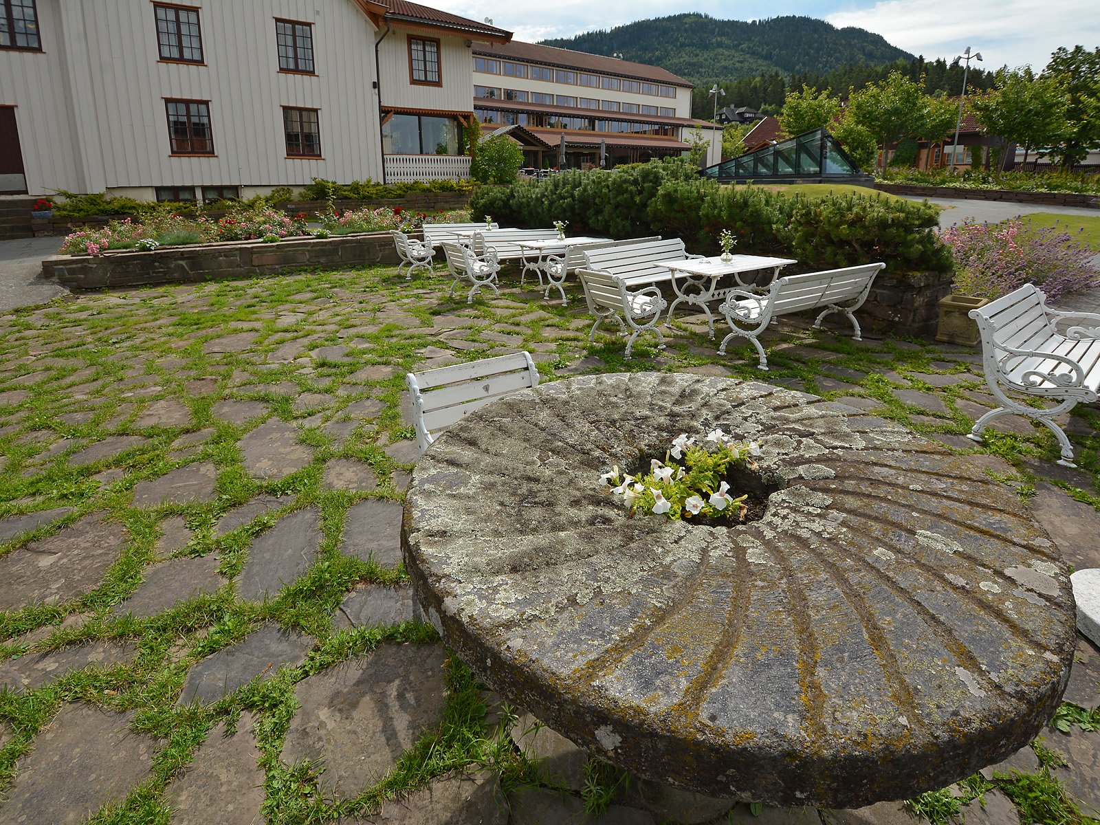 MØLLESTEIN: Driften på Sundvoll-mølla opphørte ca. år 1900, og mølla ble revet i 1909. Det er ikke mange spor tilbake etter den, men utenfor Sundvolden Hotel skal det være tre møllesteiner som brukes som ildfaste hagebord. Her er det best bevarte av dem. I bakgrunnen åsen syd for Krokkleiva med Kongens utsikt.