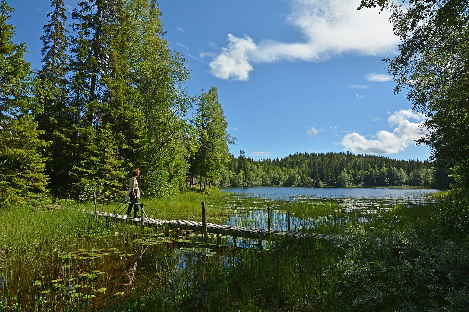FIN KLOPP: Fra den østre demningen ved Bønnerudtjern er det mulig å følge sti til hytta i nordøstenden av vannet. Myra i nordenden av vannet er meget våt, og for å komme til fortsettelsen av stien på vestsiden av vannet, er det derfor bygget en fin klopp over enden av vannet. På den andre siden av vannet skimtes ei tømmerhytte. Antageligvis ei hoggerhytte, som nå blir rehabilitert og bygget på.