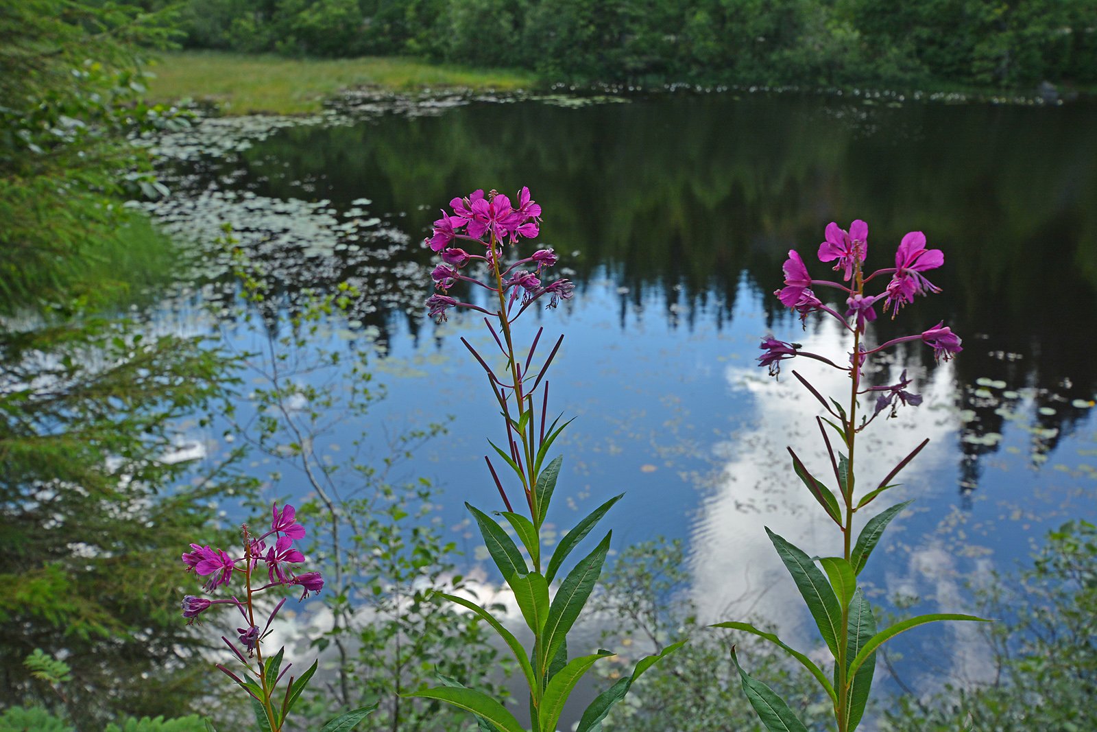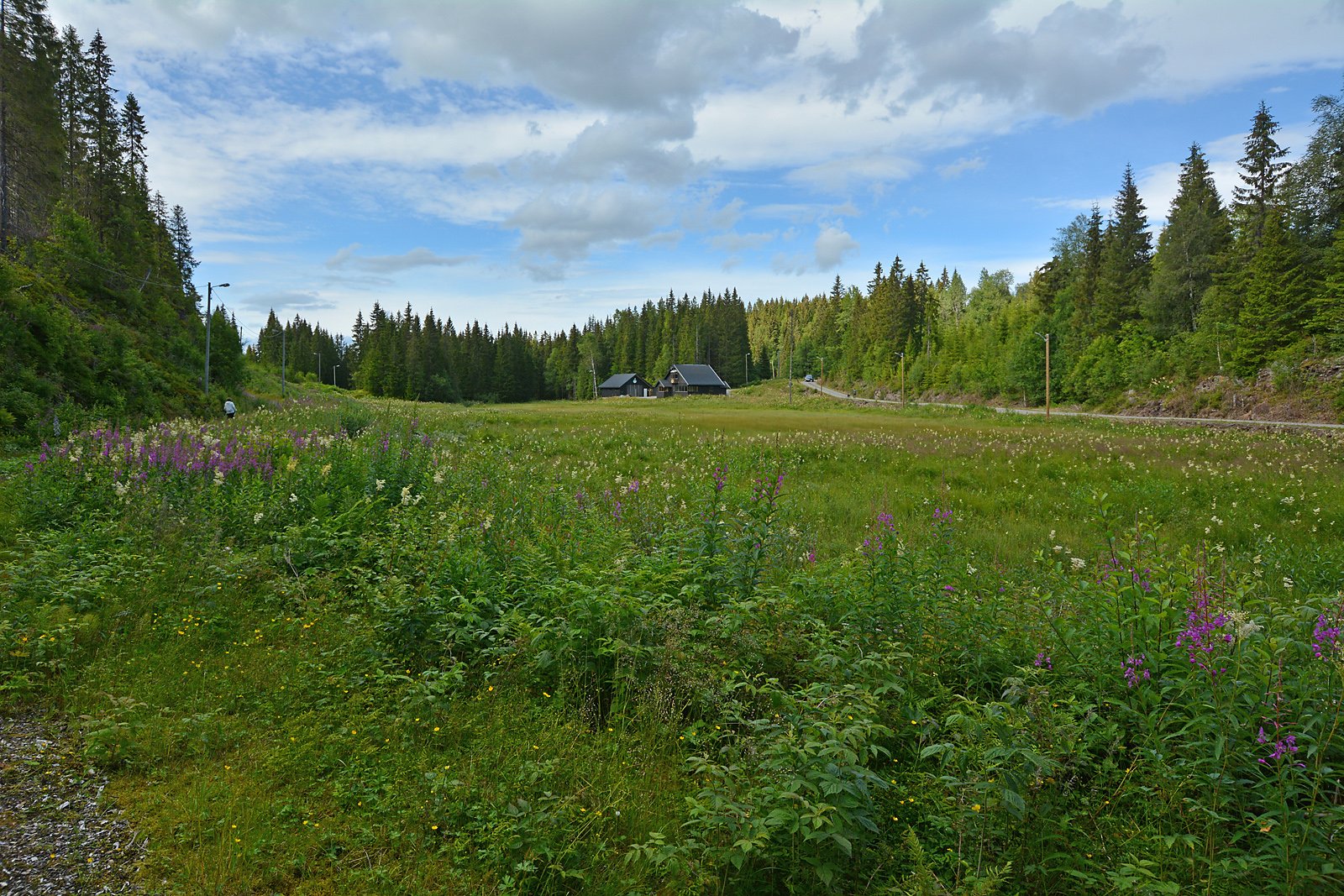 GEITRAMS OG VANNLILJER: Lysløypa fra Bergenske Kongevei går over et stort hogstfelt til sydenden av Nordsetertjern. Over et lite stup er det bra utsikt mot sydenden av vannet. Myra syd for vannet var fuktig, men greit passérbar også denne våte sommeren. Sørsetraveien er synlig gjennom løvverket på motsatt side av vannet.