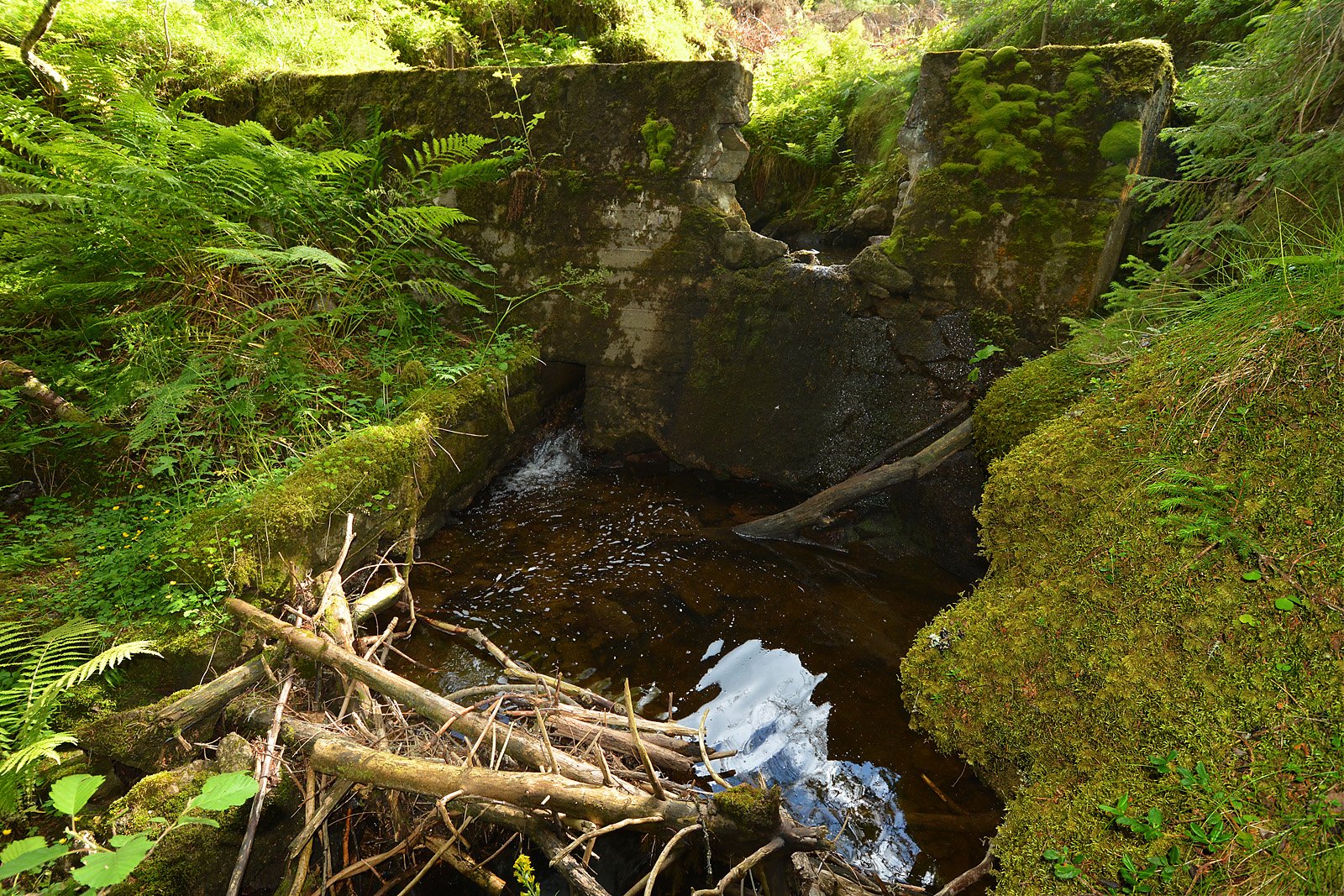 AVLØP I BUNNEN: Dette er samme demning som over, men tatt fra en annen vinkel for å kunne se om det er et utløp for en rørledning eller lignende. I nedre venstre hjørne er det et firkantet utløp med en oppmurt betongrygg ved siden. Kan det ha vært ei åpen trerenne her, eller et overgangsstykke til en rørledning? På toppen av damkronen er det et vannledningsrør med gjenget ende, men det treffer ikke i utløpet fra demningen