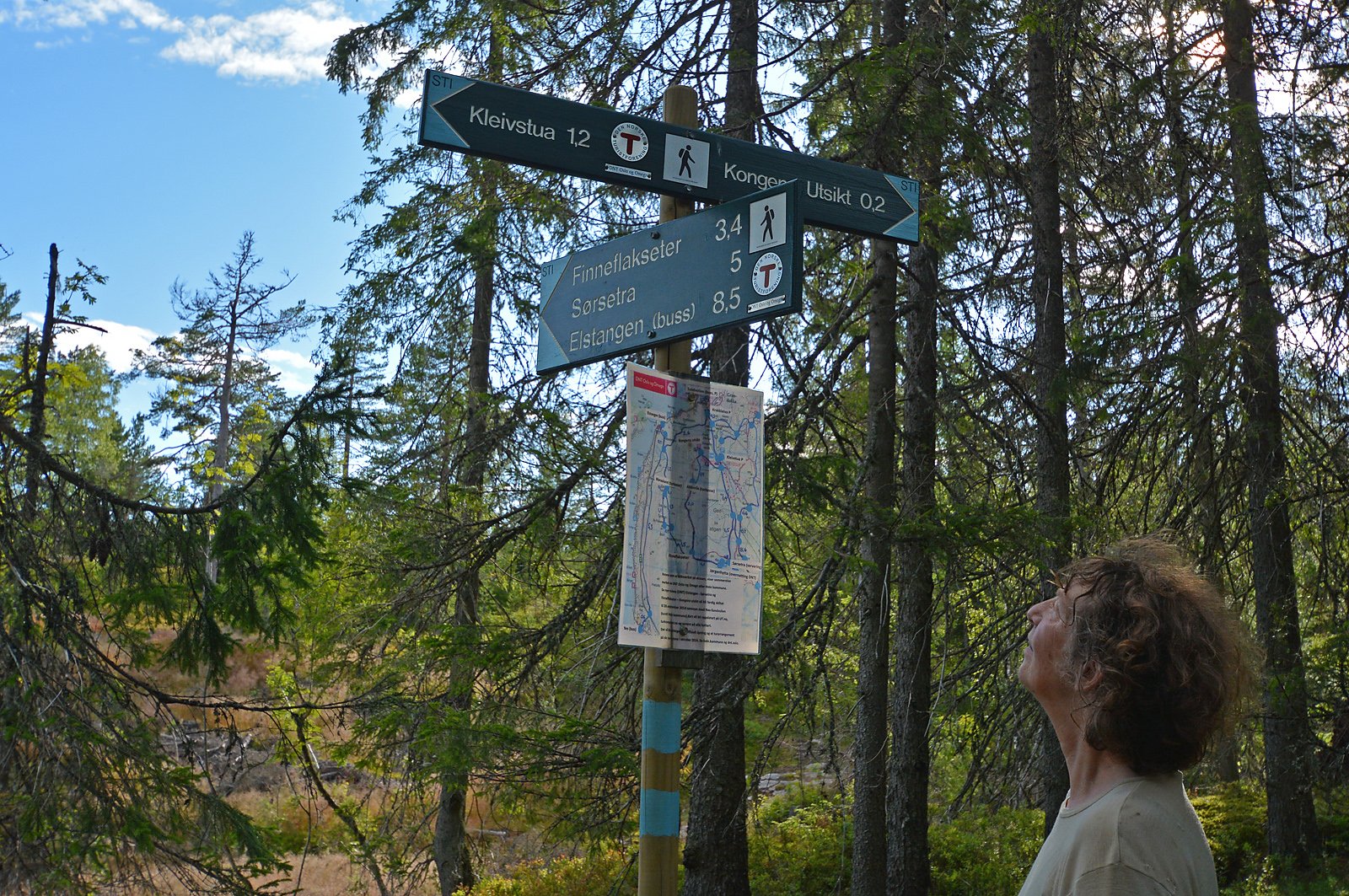 NY STI: DNT er i ferd med å skifte ut og oppgradere sine skilt i Marka. Her, 200 meter sydøst for Kongens Utsikt, har det også kommet til en ny, blåmerket sti til Finneflakseter. Den følger skiløypa mesteparten av veien oppover, men går nær nordenden av Åbortjern og over Åboråsen i stedet for å gå vest for Åboråsen.