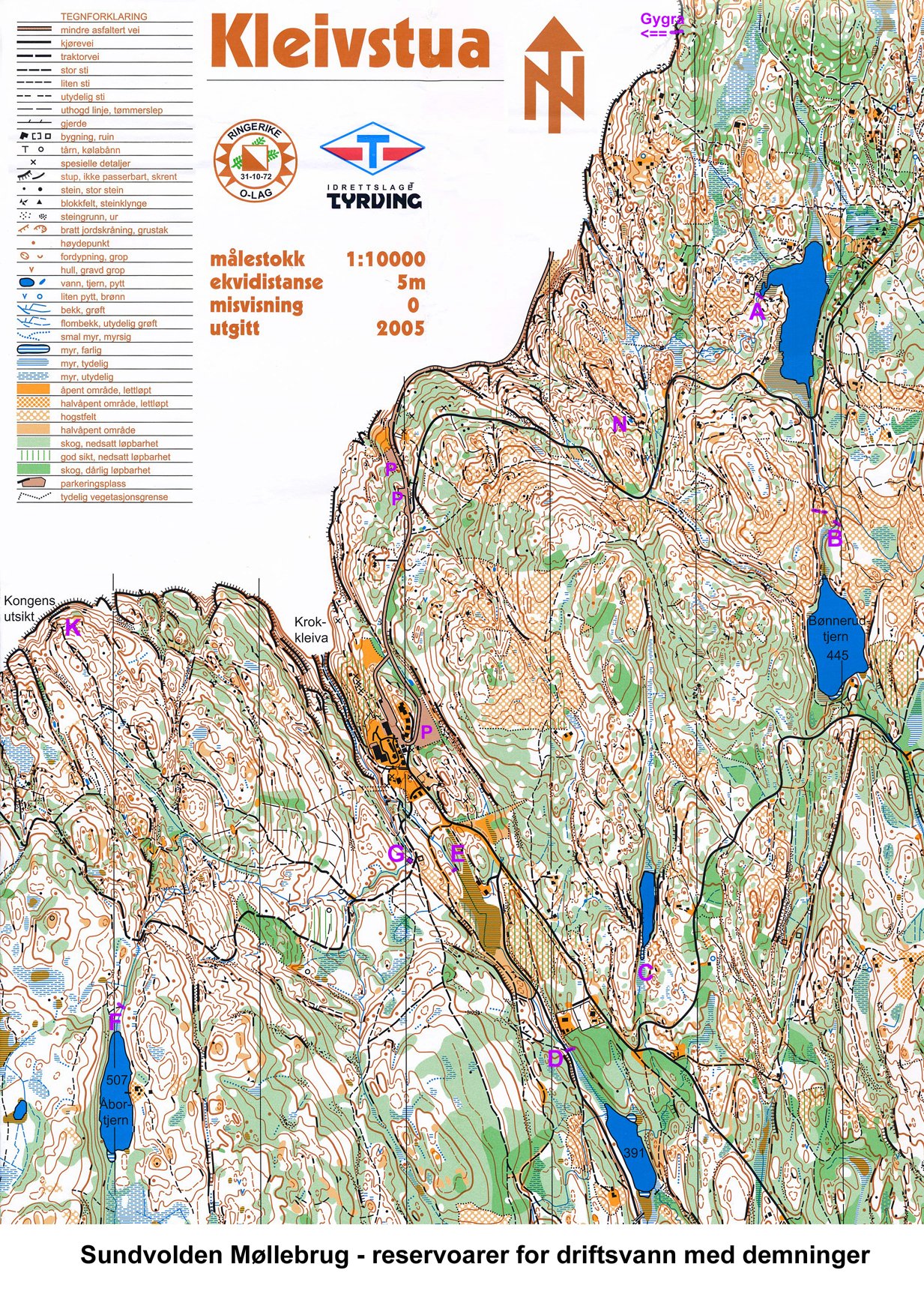 EN FEMTE DEMNING: Kombinasjonen av Hole Bygdebok bd. V og et detaljstudium av orienteringskartet over området, se bilde nr. 17312, viste at det sannsynligvis fantes en femte demning for driftsvann til Sundvolden Møllebrug. Til nå ukjent, i den betydning at det i nyere litteratur, som for eksempel Kjentmannshåndboken, bare er nevnt fire demninger. Men her er den, selv om den er tegnet inn med et uvanlig symbol på o-kartet, i nordvestenden av den store, gule (åpne) myra sydøst for Kleivstua. I enkelte kilder er den kalt for Kleivtjernet, som også var det gamle navnet på Bønnerudtjern, hvor det også var demning.