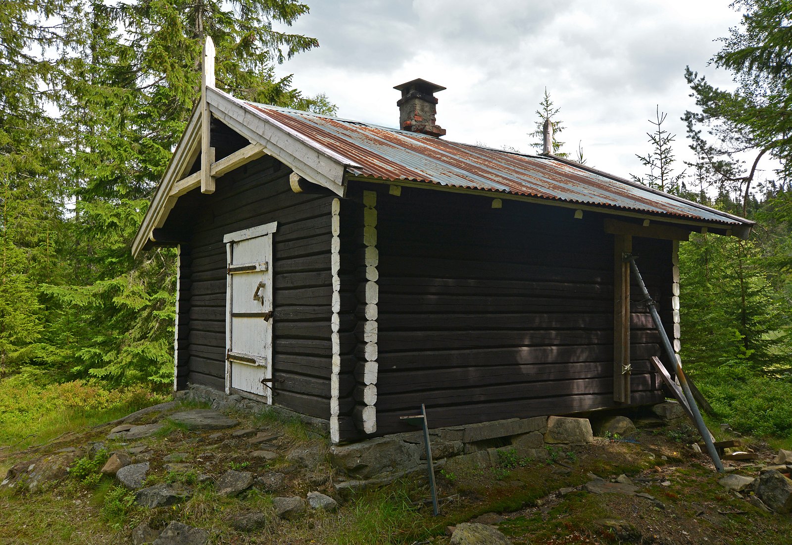 BLOKSBERG: Vest for Åbortjern ligger hytta Bloksberg. Velholdt, men ikke mye brukt nå for tiden om man skal dømme ut fra stien dit. Flaggstangens litt spesielle utseende skyldes ikke objektivfeil, men at fundamentet er i ferd med å gli ut.