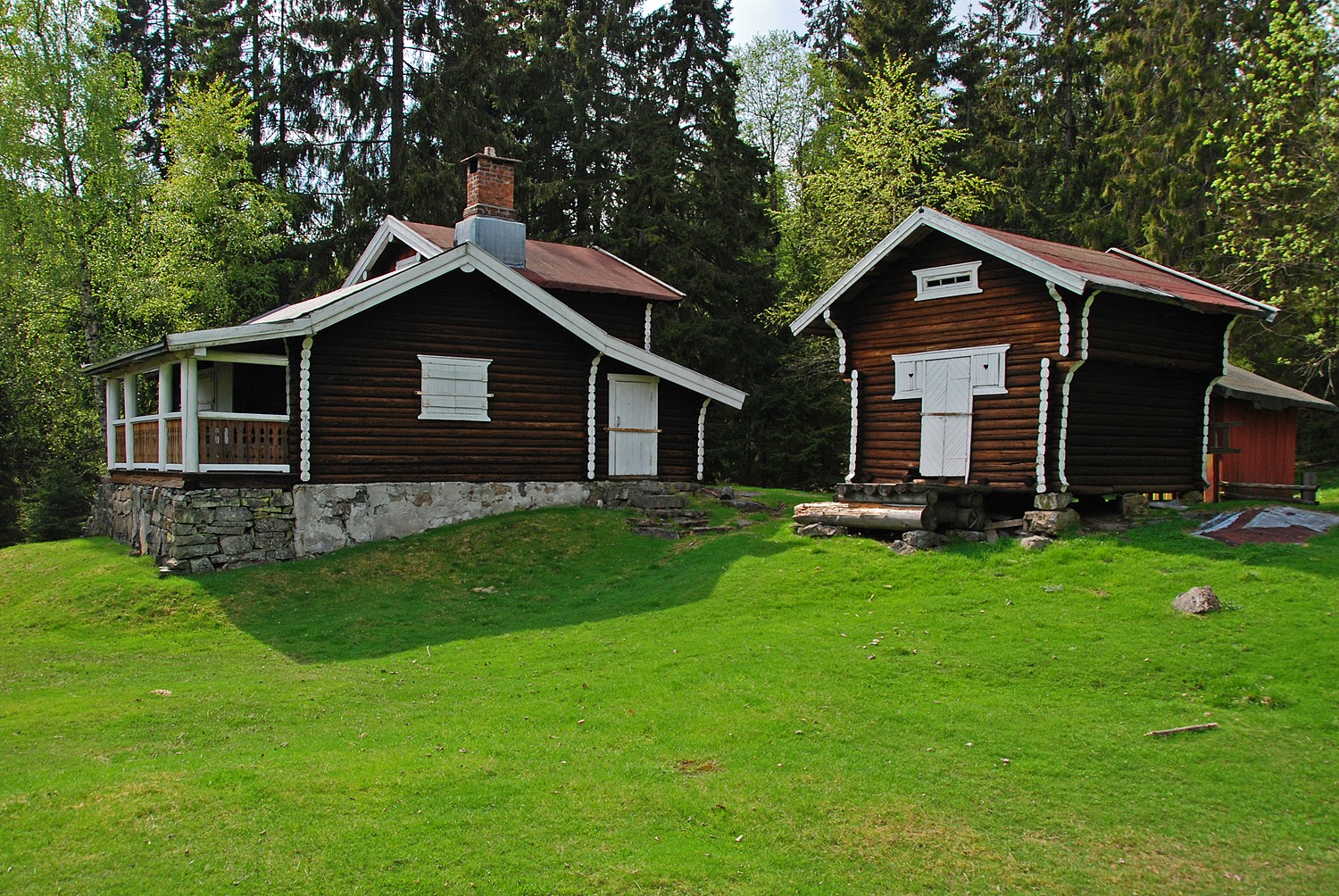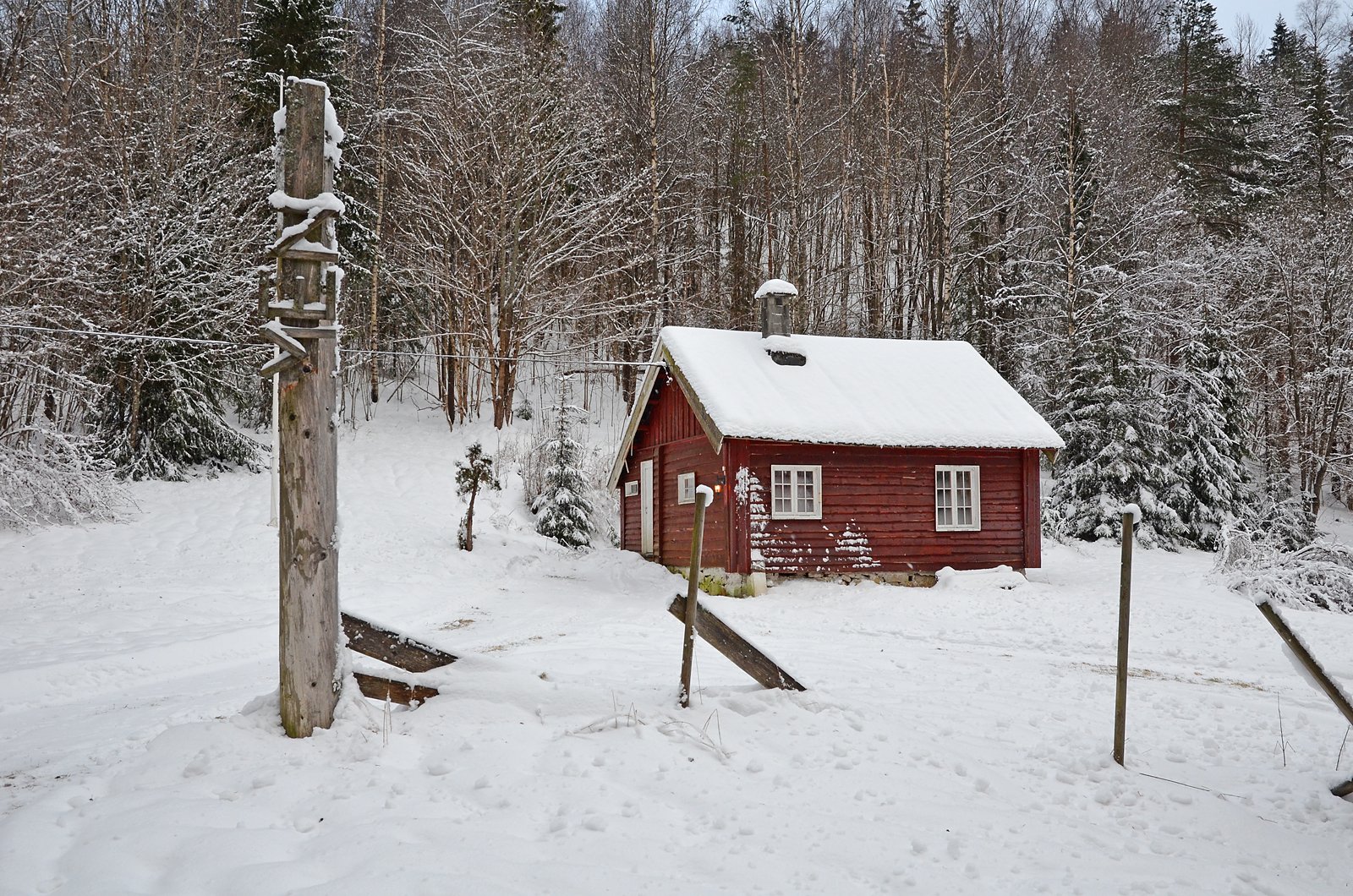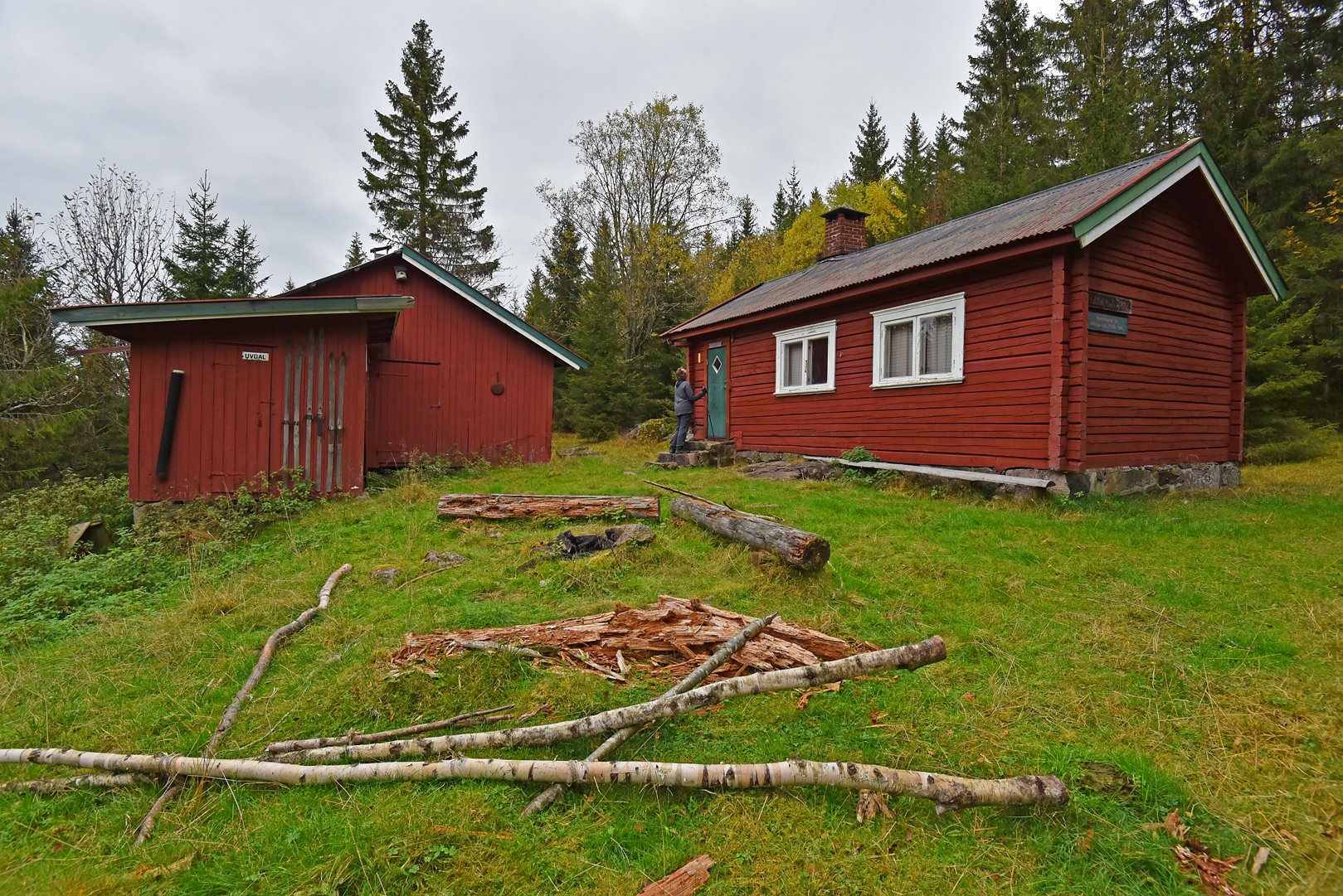 SKIKLUBBEN STARKAD: Slik så hytta til skiklubben «Starkad» i 2008. Forskjellene mellom da og 2018 er at det har blitt laget ny tram til stabburet, det røde skjulet bak dette har bleknet og kledningen har begynt å råtne nederst. Noen kilder sier at hytta ble bygget der husene på den gamle husmannsplassen hadde ligget. Disse ble brent ned da plassen ble fraflyttet rundt år 1900.