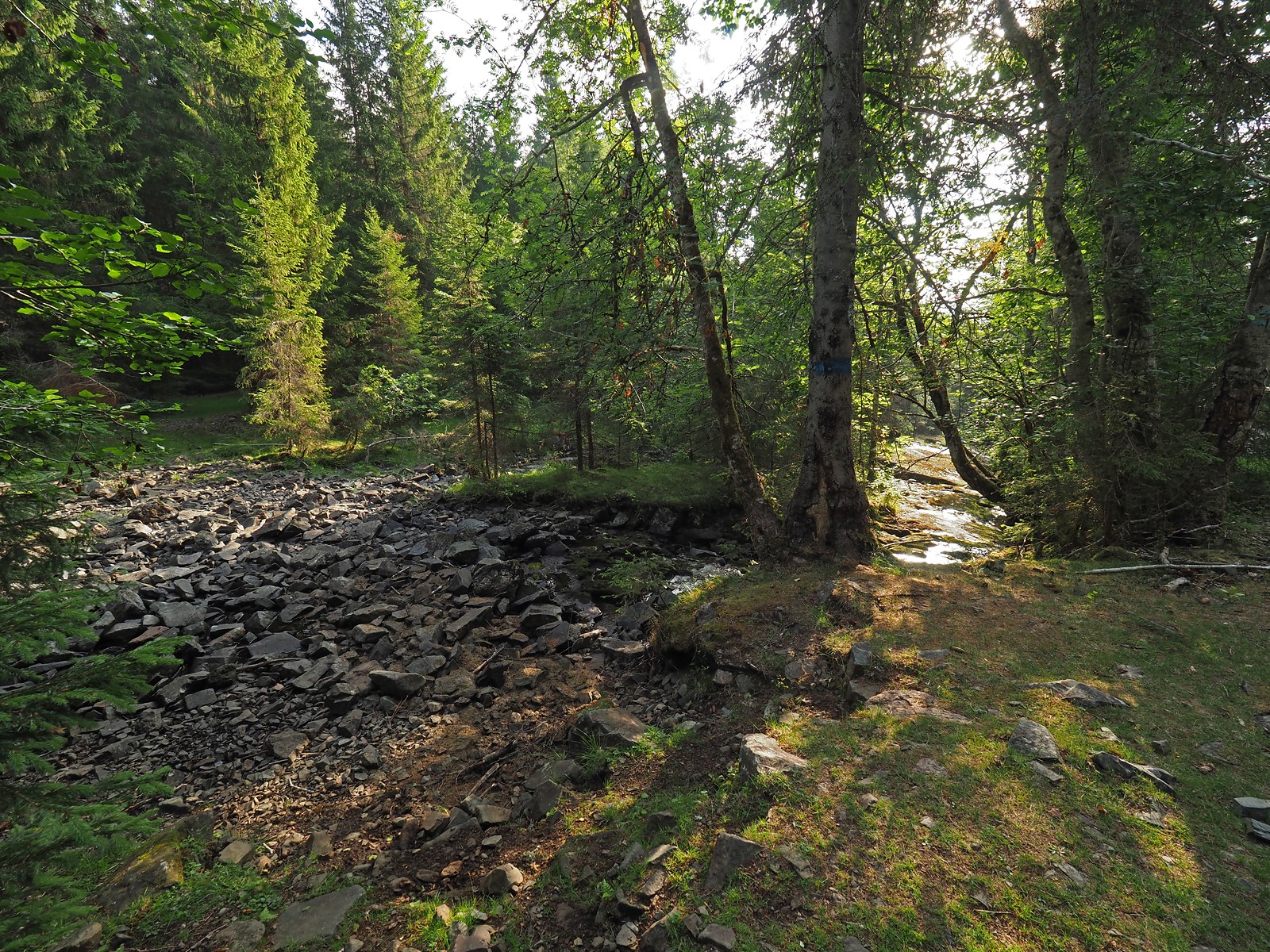 Nå fortsetter blåstien på nordsiden av elva, av og til nesten inntil den, av og til lenger vekk. Om man i stedet for å gå blåstien vil følge elva hele veien, blir turen lett til en liten dagstur gjennom kratt og opp og ned skrenter. Men turen langs og i elva gjemmer små idyller som denne, som gir belønning for strevet. Langs blåstien er det i juni/juli store arealer med ramsløk, en plante som kan luktes lenge før den kan sees.