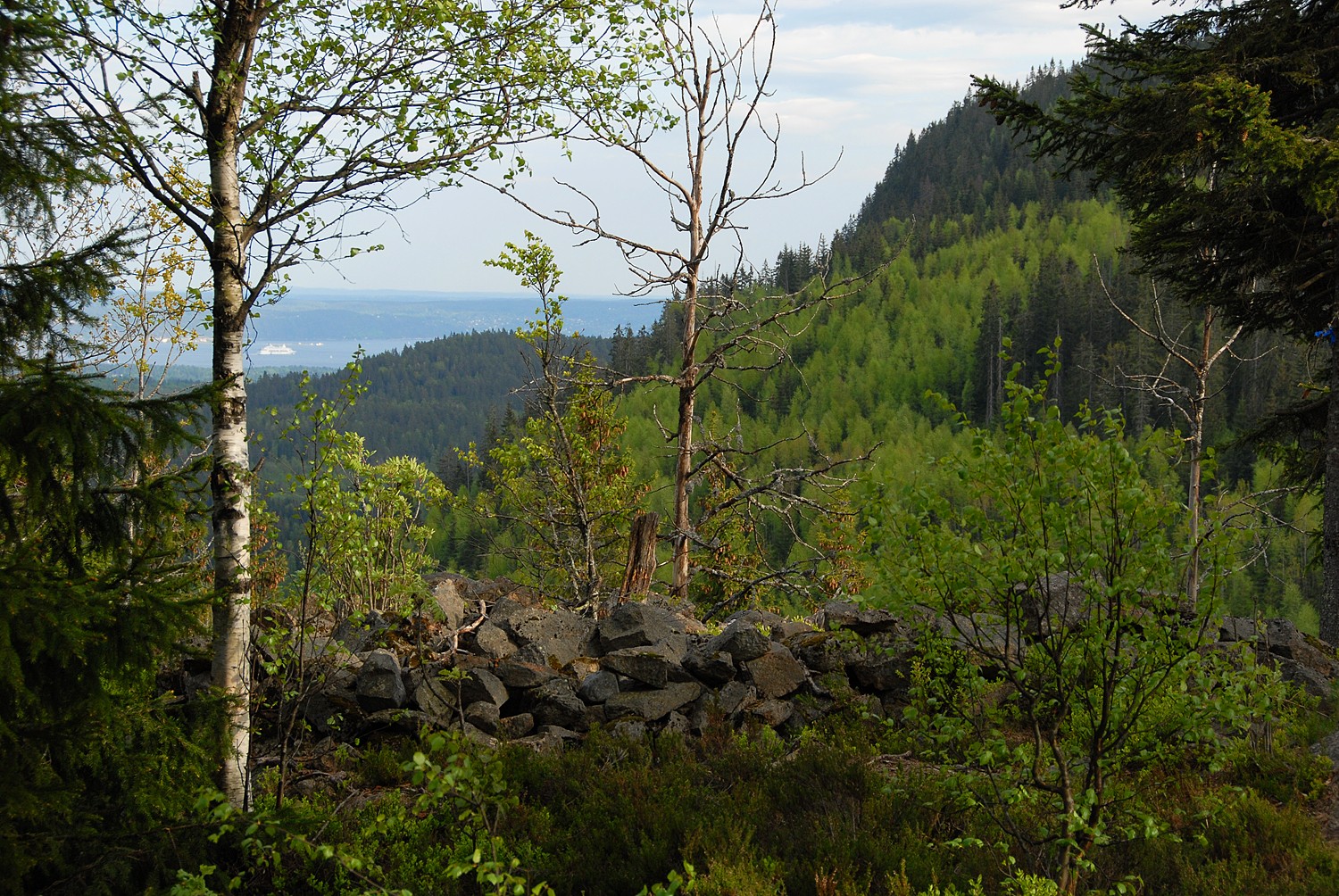 GRAVRØYS: På Risfjellet rett nord for Ursdalens øvre del ligger det fem bronsealdergravrøyser og en mindre røys av jernaldertype. Som det høver seg for gravrøyser fra denne tiden, var utsikten formidabel. Røysa på bildet tilhører de minste og er ganske rasert, men er den hvor utsikten er minst tilgrodd, og derfor fortsatt best. Diameter for denne er åtte meter og anslått steinvolum ni kubikkmeter, mens det for de største, som ligger nærmere rassonen til åsen Knallru, er diameter 14 meter og volum omkring 75 kubikkmeter.