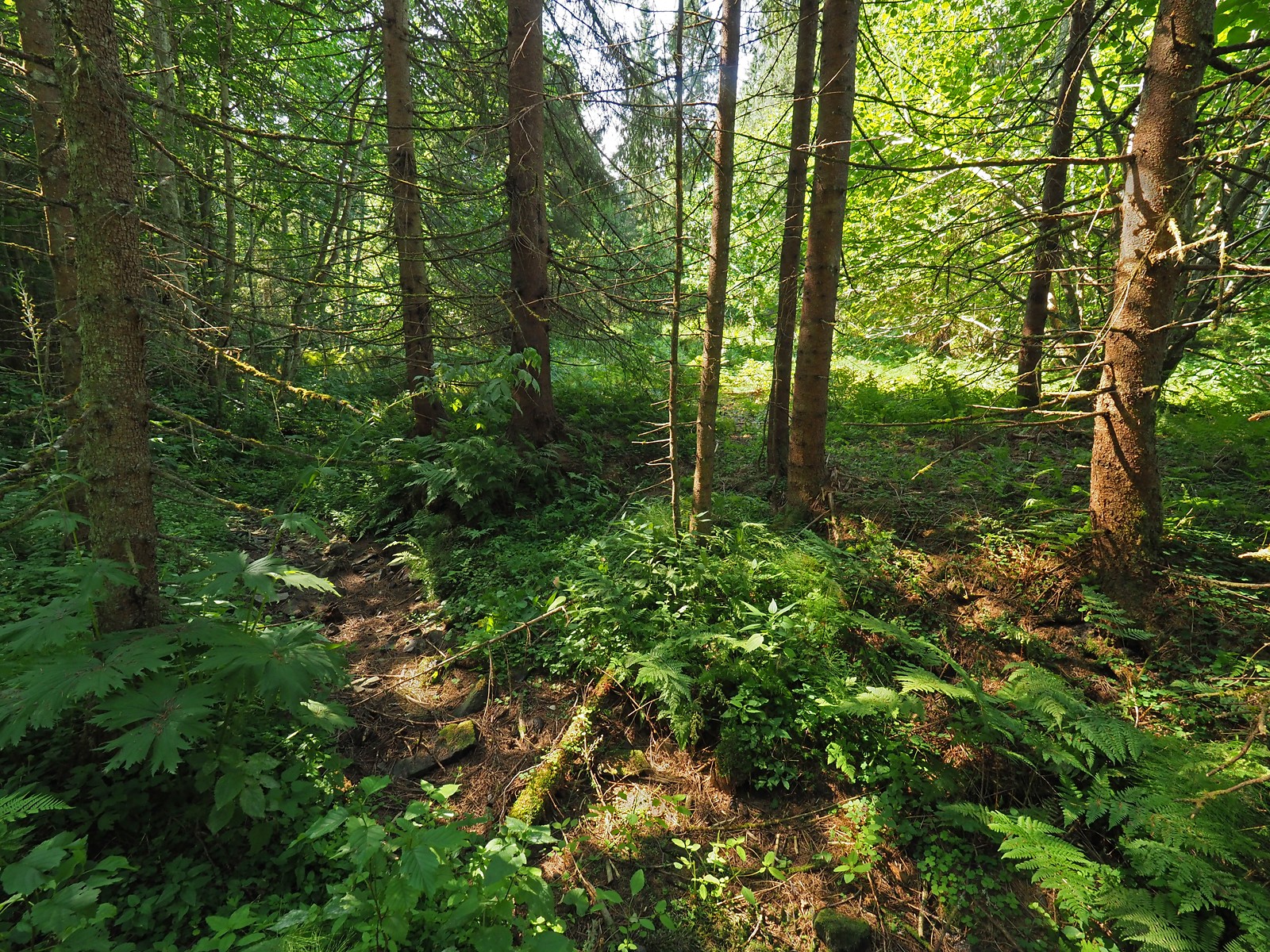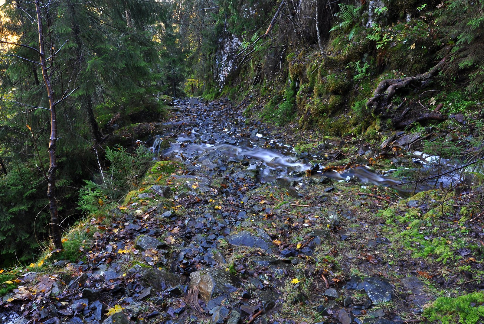 SPOR ETTER EN TØMMERVEI: I elveleiet i Ursdalen blir stup og skrenter avløst av flatere partier med til dels storsteinet ur. Tett vegetasjon og falne trær er det hele veien, med store partier med høy strutseving over ur. Det er tidkrevende og vanskelig å ta seg frem både i elveleiet og ved siden av, spesielt fordi det mange steder er stor brennesle innimellom annen vegetasjon. Dette tyder på at det har vært husdyr i området, og etter litt søk var det mulig å finne en delvis opparbeidet gammel tømmervei. Den var riktignok helt nedgrodd, men likevel et brukbart alternativ til de verste delene av elveløpet.