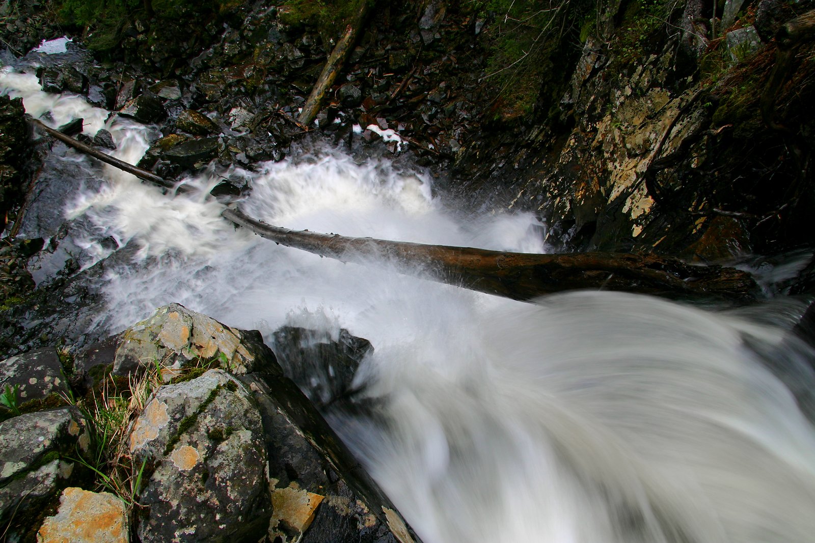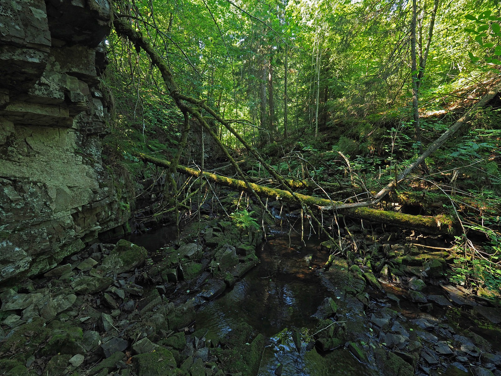 MINICANYON: Etter en snau kilometer går elva i Ursdalen helt inntil jordekanten på østsiden. Igjen er det stup og skrenter på begge sider av elveløpet, og det har dannet seg en liten canyon som man må gjennom for å komme ut av. Glatte, mosegrodde steiner og tett med store vindfall gjorde dette til en tidkrevende oppgave. Elveløpet videre oppover langsmed jordet var helt overgrodd med varmekjær løvskog, så her var det mest fornuftig å komme seg opp på jordet og så følge jordekanten videre til veien. En tur langs denne delen av elva bør nok gjennomføres før kantvegetasjonen vokser opp eller etter at den har visnet ned.