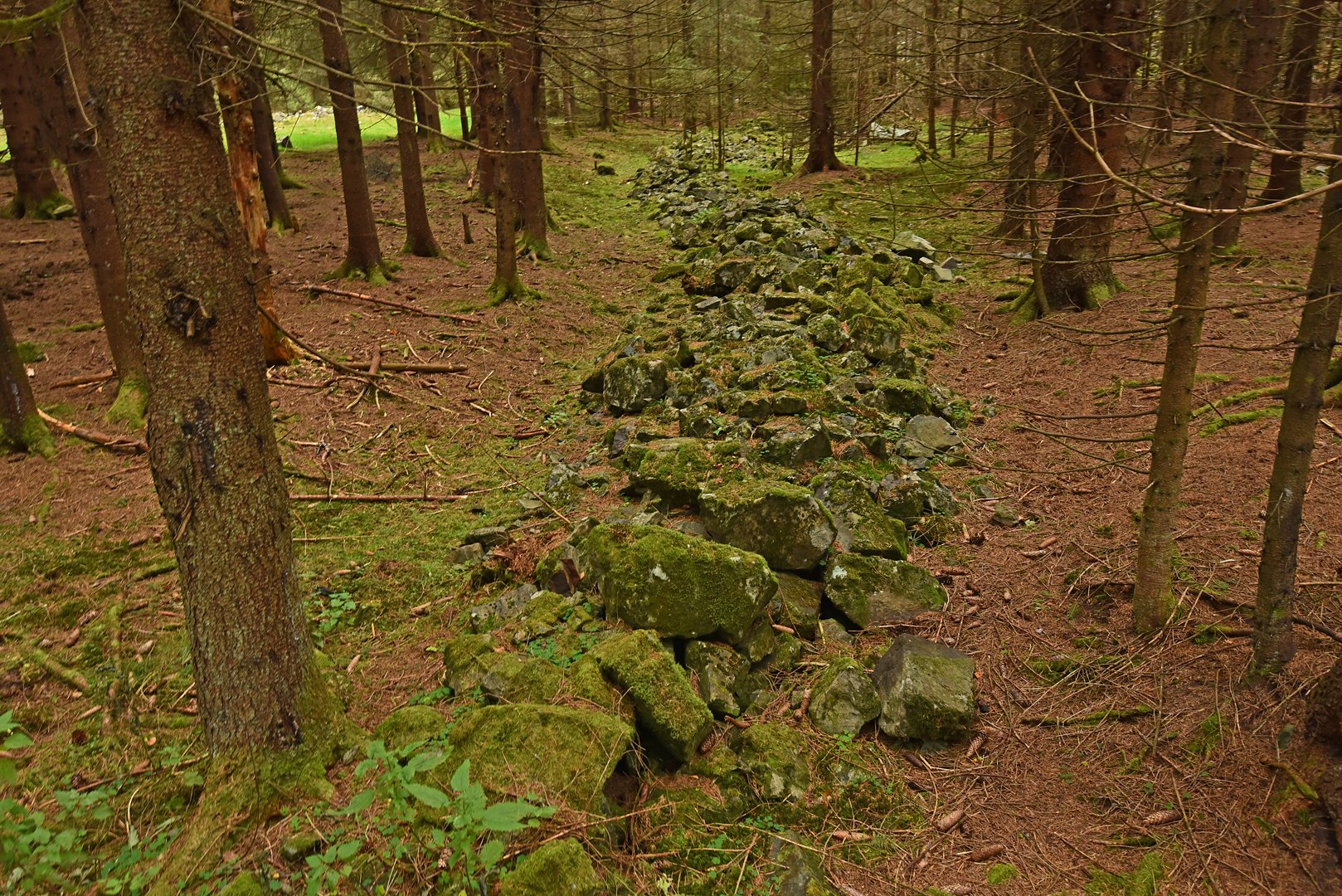 RYDNINGSRØYS: Der blåstien fra Persbråtan på nordsiden av elva krysser elva til Skosliteren, heter det Nedre vad. Videre på nordsiden av elva mot Risfjellkastet er det en fin grasslette som nå dessverre er i ferd med å vokse til med gran. Dette er Kasteløkka, hvor det i alle fall var dyrket jord. Hustufter har vi ikke funnet. Det var steinrik grunn her, noe som den lange rydningsrøysa inne i skogen tydelig viser.