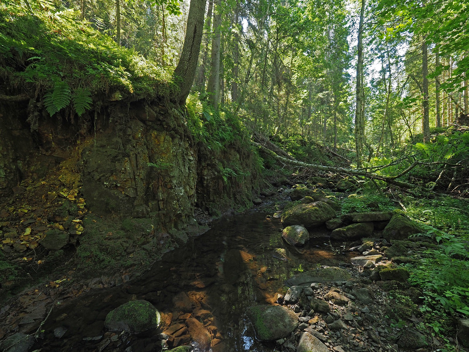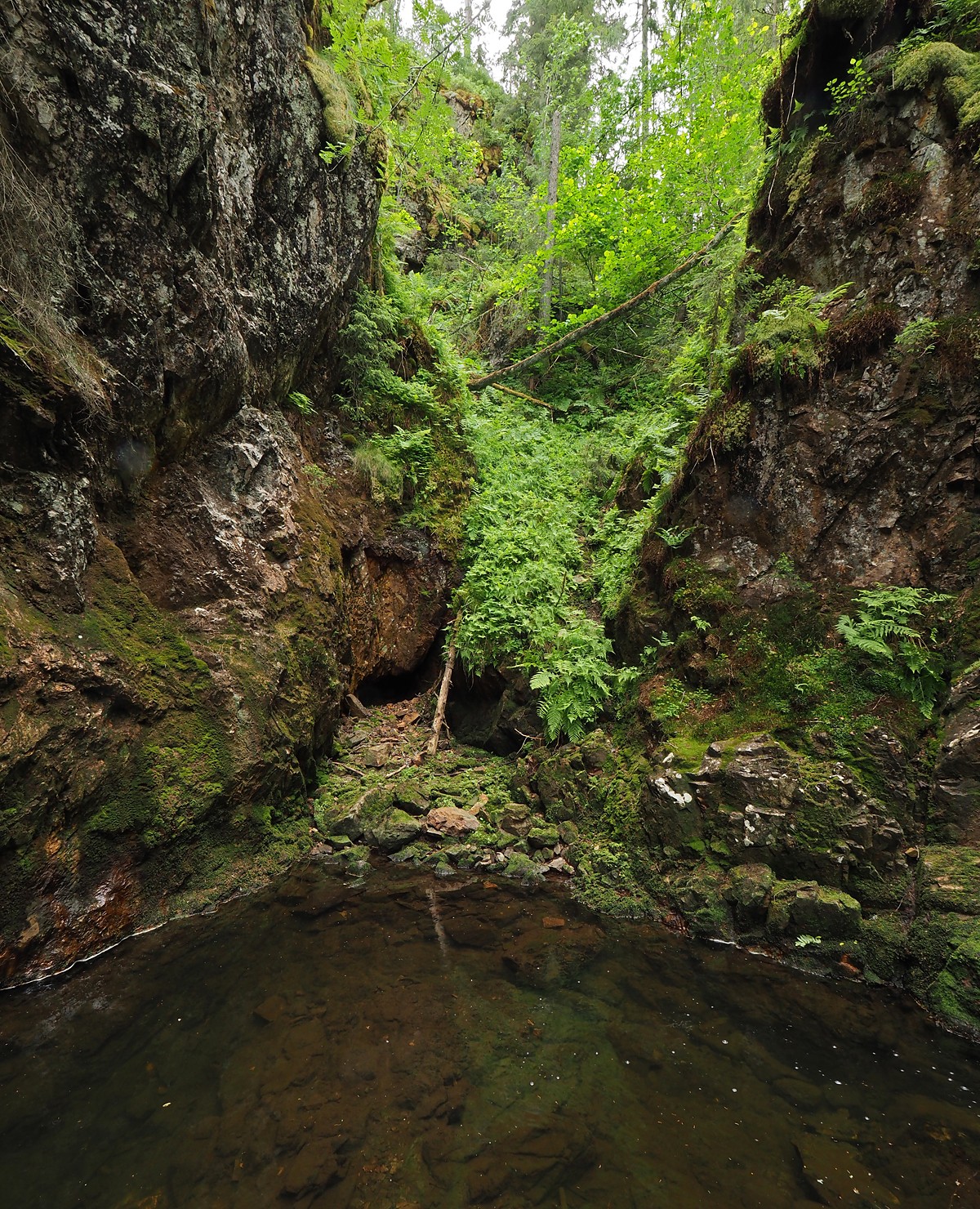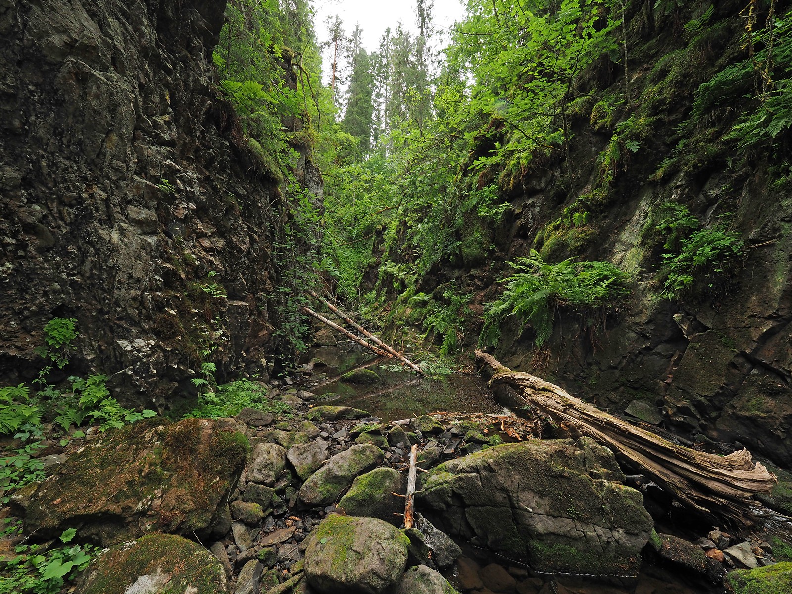 URSDALEN ELVECANYON: Bunnen i denne kløfta er steinet og glatt, og ganske uryddig med vindfall. Stedvis er det vanndammer som dekker hele bunnen, og gjør det vanskelig å passere tørrskodd selv ved så liten vannføring som nå etter tørken. Selv ved normal sommervannføring vil det være krevende å ta seg frem her, og i flom vil elva hele veien dekke hele bunnen og gå opp på sidene.