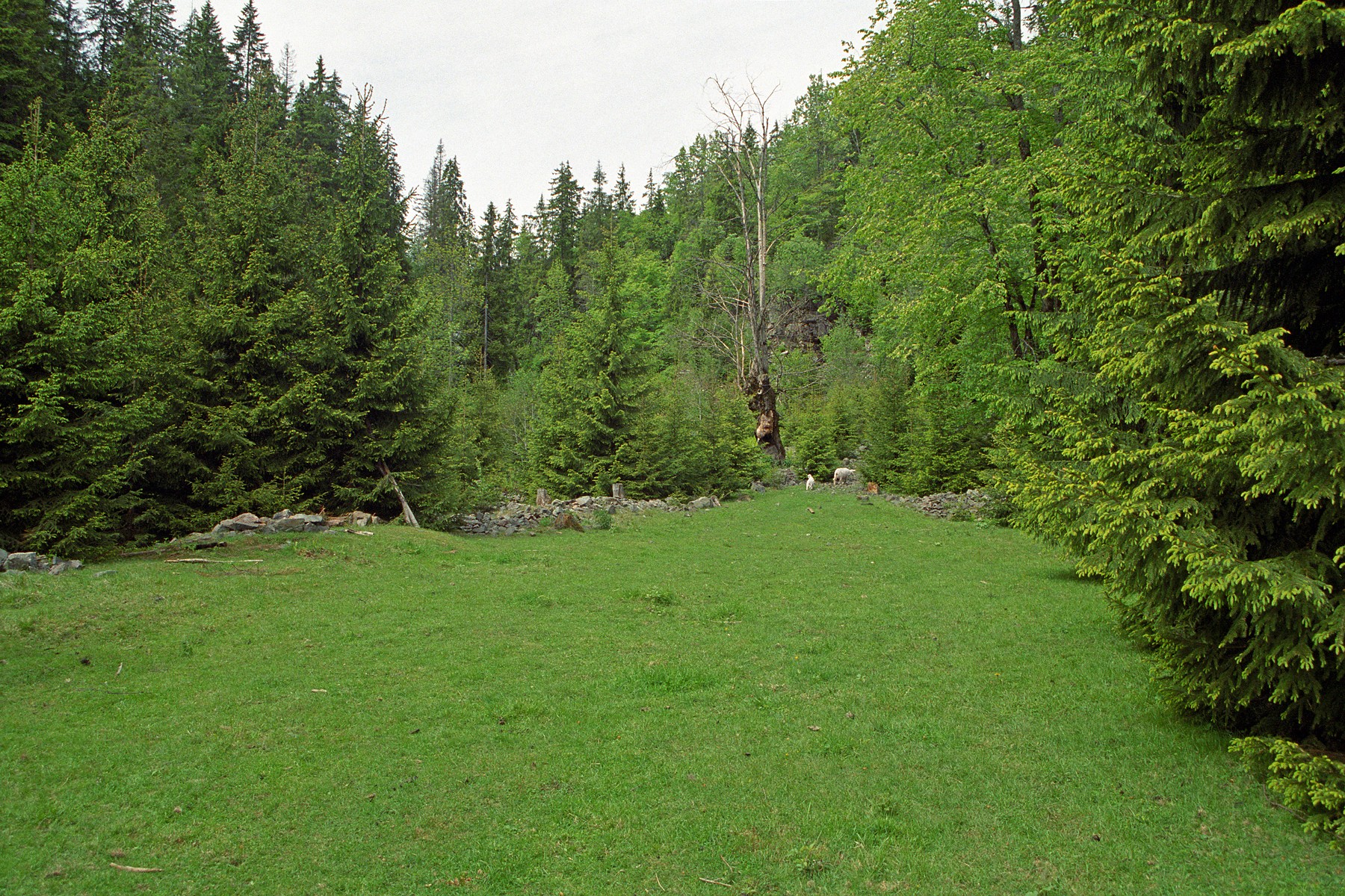 SLÅTTETEIG: På nordsiden av elva ved Nedre Vad og videre innover mot Risfjellkastet lå denne fine grassletta med ærverdig tuntre i enden, slik dette bildet fra 2000 viser. Nå (i 2018) er dessverre sletta i ferd med å vokse til med gran, og tuntreet har for lengst råtnet og falt. Men sauer holder til her fortsatt. Dette er Kasteløkka, en av slåtteteigene til husmannsplassen Riisfjeldet.